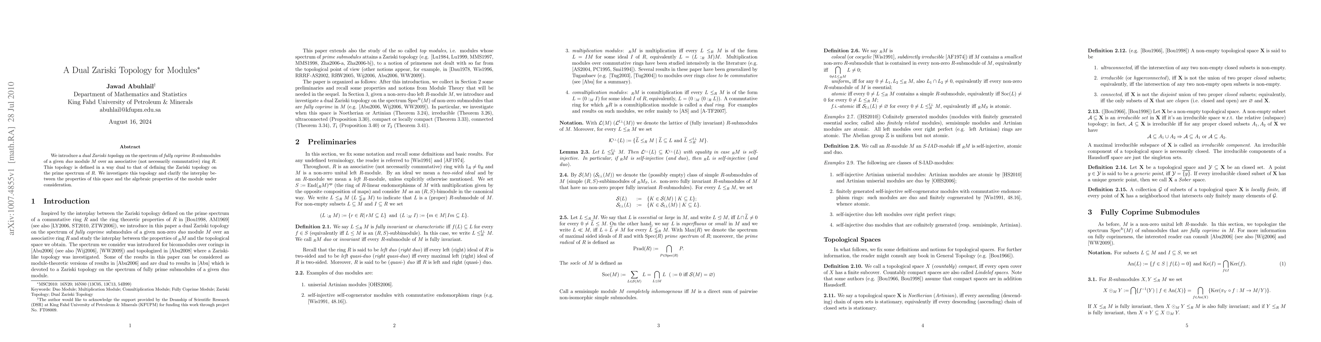 This paper introduces a dual Zariski topology on the spectrum of fully coprime $R$-submodules of a duo module $M$ over a ring $R$, analogous to the Zariski topology on the prime spectrum of $R$. It explores the topological and algebraic properties of this new space.