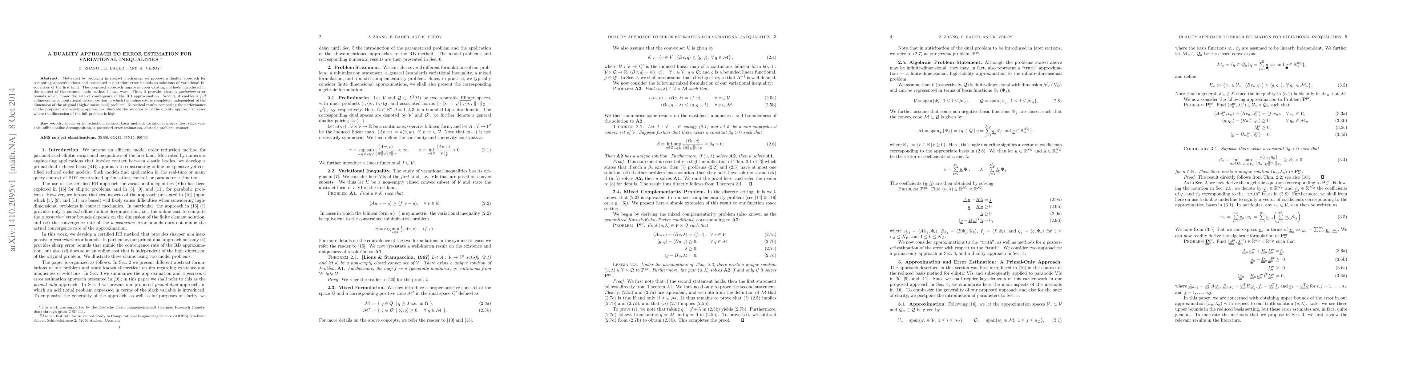 Motivated by problems in contact mechanics, we propose a duality approach for computing approximations and associated a posteriori error bounds to solutions of variational inequalities of the first kind. The proposed approach improves upon existing methods introduced in the context of the reduced basis method in two ways. First, it provides sharp a posteriori error bounds which mimic the rate of convergence of the RB approximation. Second, it enables a full offline-online computational decomposition in which the online cost is completely independent of the dimension of the original (high-dimensional) problem. Numerical results comparing the performance of the proposed and existing approaches illustrate the superiority of the duality approach in cases where the dimension of the full problem is high.