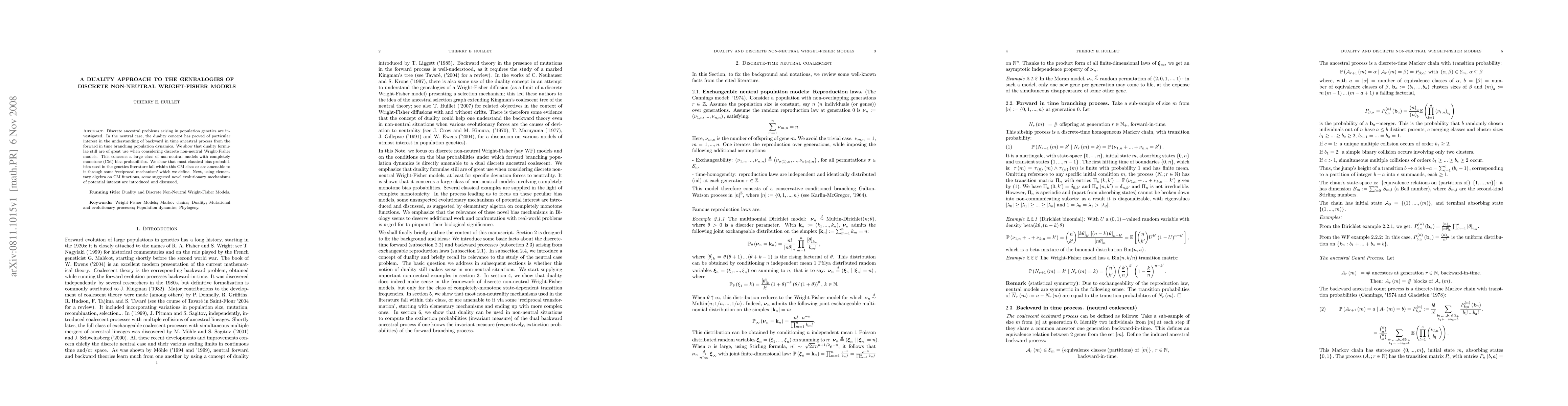 Discrete ancestral problems arising in population genetics are investigated. In the neutral case, the duality concept has proved of particular interest in the understanding of backward in time ancestral process from the forward in time branching population dynamics. We show that duality formulae still are of great use when considering discrete non-neutral Wright-Fisher models. This concerns a large class of non-neutral models with completely monotone (CM) bias probabilities. We show that most classical bias probabilities used in the genetics literature fall within this CM class or are amenable to it through some `reciprocal mechanism' which we define. Next, using elementary algebra on CM functions, some suggested novel evolutionary mechanisms of potential interest are introduced and discussed.