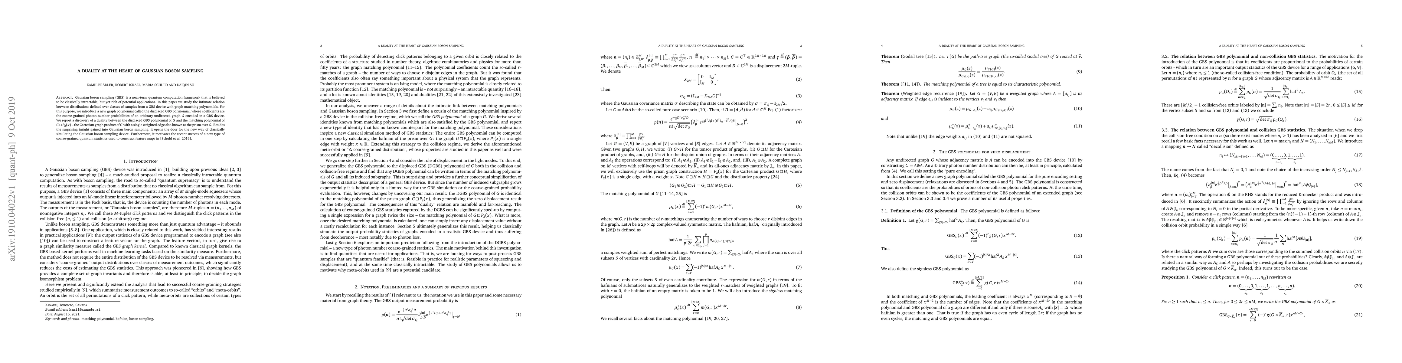 Gaussian boson sampling (GBS) is a near-term quantum computation framework that is believed to be classically intractable, but yet rich of potential applications. In this paper we study the intimate relation between distributions defined over classes of samples from a GBS device with graph matching polynomials. For this purpose, we introduce a new graph polynomial called the displaced GBS polynomial, whose coefficients are the coarse-grained photon-number probabilities of an arbitrary undirected graph $G$ encoded in a GBS device. We report a discovery of a duality between the displaced GBS polynomial of $G$ and the matching polynomial of $G\,\square\,P_2(x)$ - the Cartesian graph product of $G$ with a single weighted edge also known as the prism over $G$. Besides the surprising insight gained into Gaussian boson sampling, it opens the door for the new way of classically simulating the Gaussian boson sampling device. Furthermore, it motivates the recent success of a new type of coarse-grained quantum statistics used to construct feature maps in [Schuld et al. 2019].