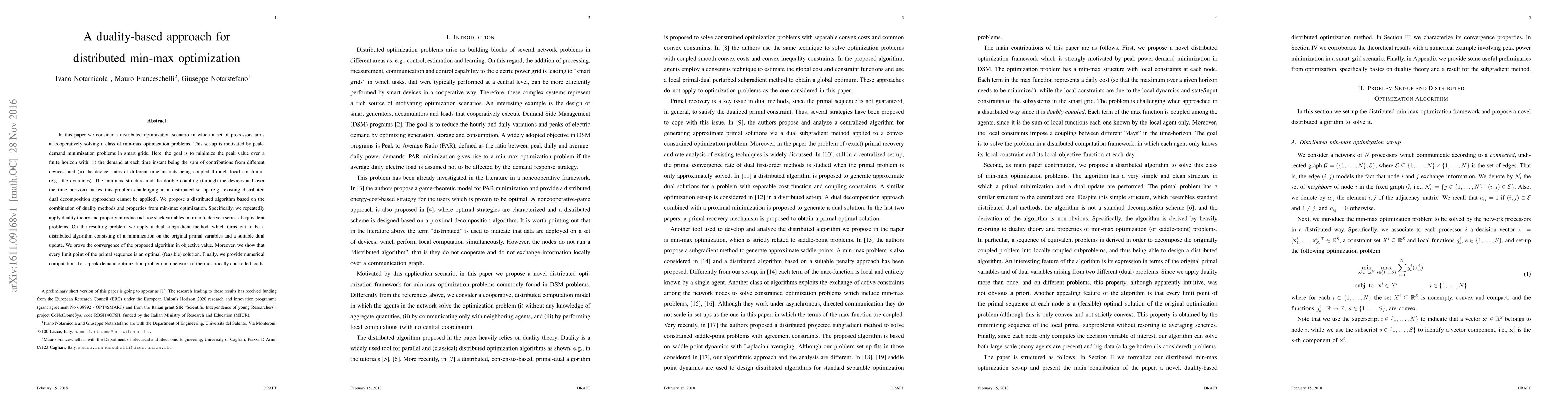 This paper proposes a distributed algorithm for solving min-max optimization problems in smart grids, where the goal is to minimize peak demand. The algorithm combines duality methods and introduces slack variables to transform the problem, followed by a dual subgradient method for distributed computation, proving convergence and optimality of the solution.