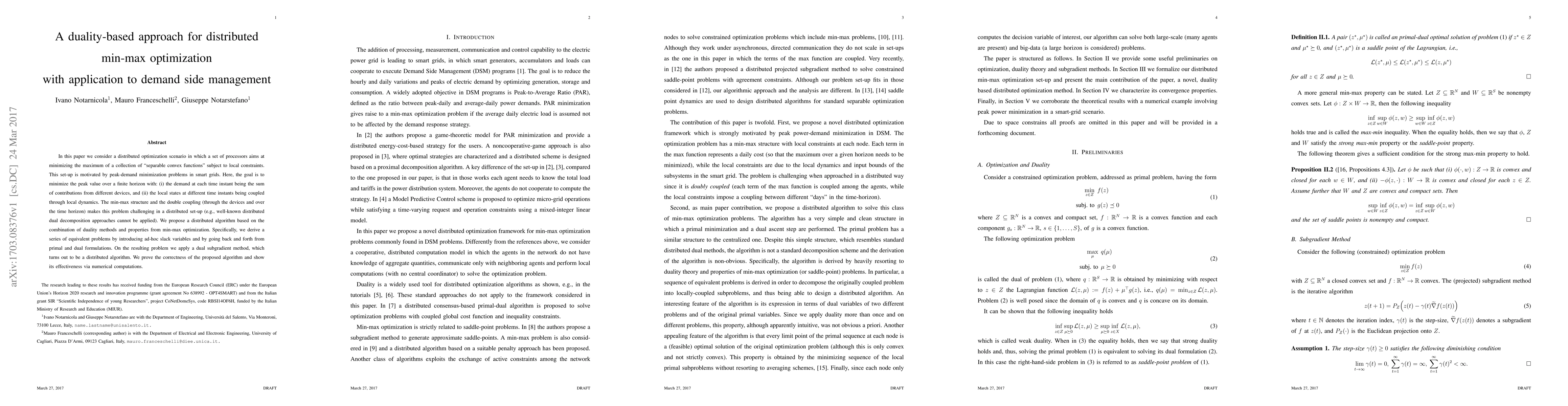 This paper proposes a distributed algorithm for minimizing the maximum of separable convex functions in smart grid peak-demand scenarios, leveraging duality and min-max optimization. The algorithm, based on dual subgradient methods, is shown to be effective through numerical computations.