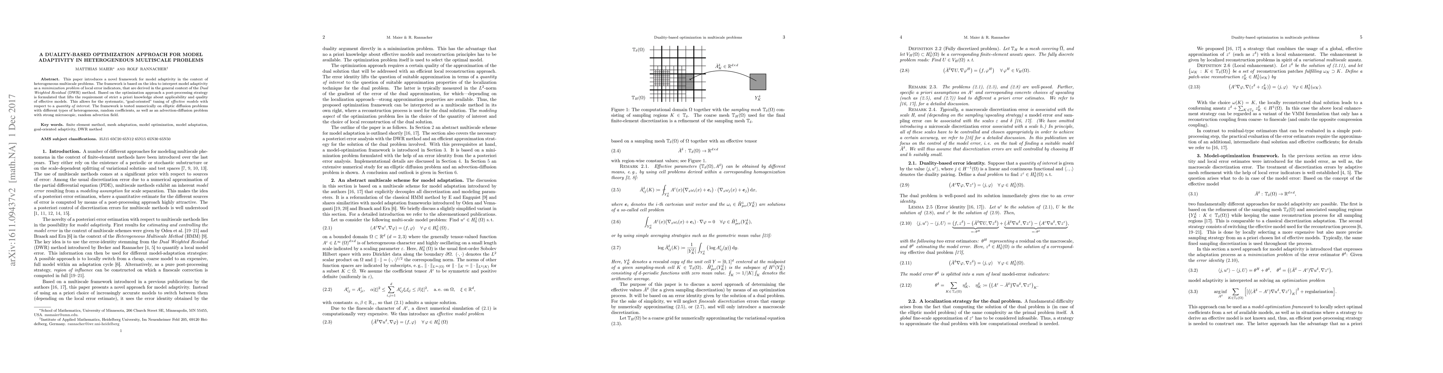This paper introduces a novel framework for model adaptivity in the context of heterogeneous multiscale problems. The framework is based on the idea to interpret model adaptivity as a minimization problem of local error indicators, that are derived in the general context of the Dual Weighted Residual (DWR) method. Based on the optimization approach a post-processing strategy is formulated that lifts the requirement of strict a priori knowledge about applicability and quality of effective models. This allows for the systematic, "goal-oriented" tuning of effective models with respect to a quantity of interest. The framework is tested numerically on elliptic diffusion problems with different types of heterogeneous, random coefficients, as well as an advection-diffusion problem with strong microscopic, random advection field.