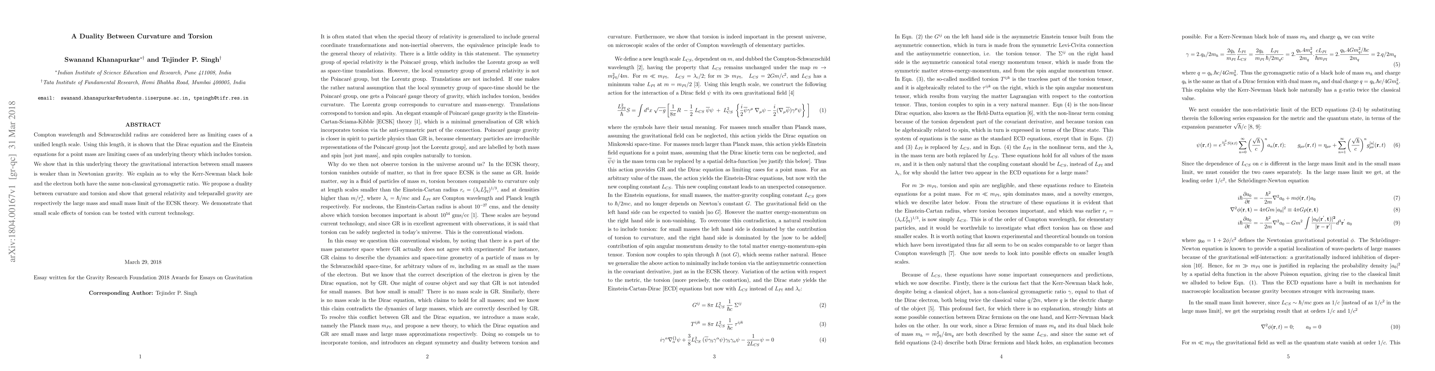 Compton wavelength and Schwarzschild radius are considered here as limiting cases of a unified length scale. Using this length, it is shown that the Dirac equation and the Einstein equations for a point mass are limiting cases of an underlying theory which includes torsion. We show that in this underlying theory the gravitational interaction between small masses is weaker than in Newtonian gravity. We explain as to why the Kerr-Newman black hole and the electron both have the same non-classical gyromagnetic ratio. We propose a duality between curvature and torsion and show that general relativity and teleparallel gravity are respectively the large mass and small mass limit of the ECSK theory. We demonstrate that small scale effects of torsion can be tested with current technology.