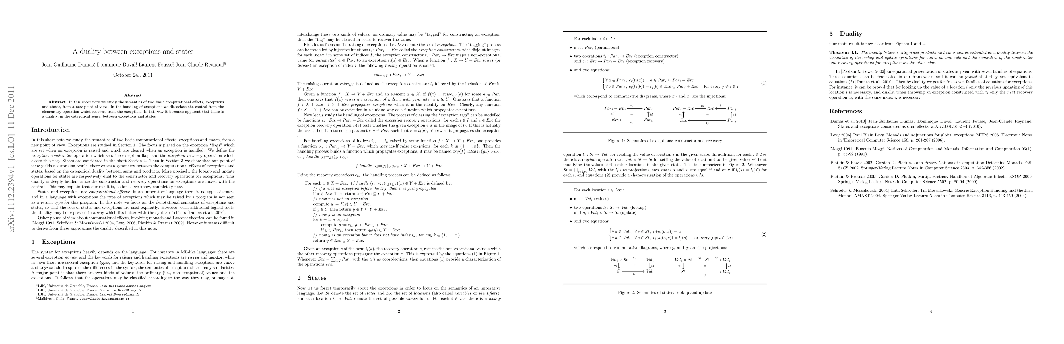 This paper explores the semantics of exceptions and states in computational effects, revealing a categorical duality between them by separating control from recovery operations in exception handling.