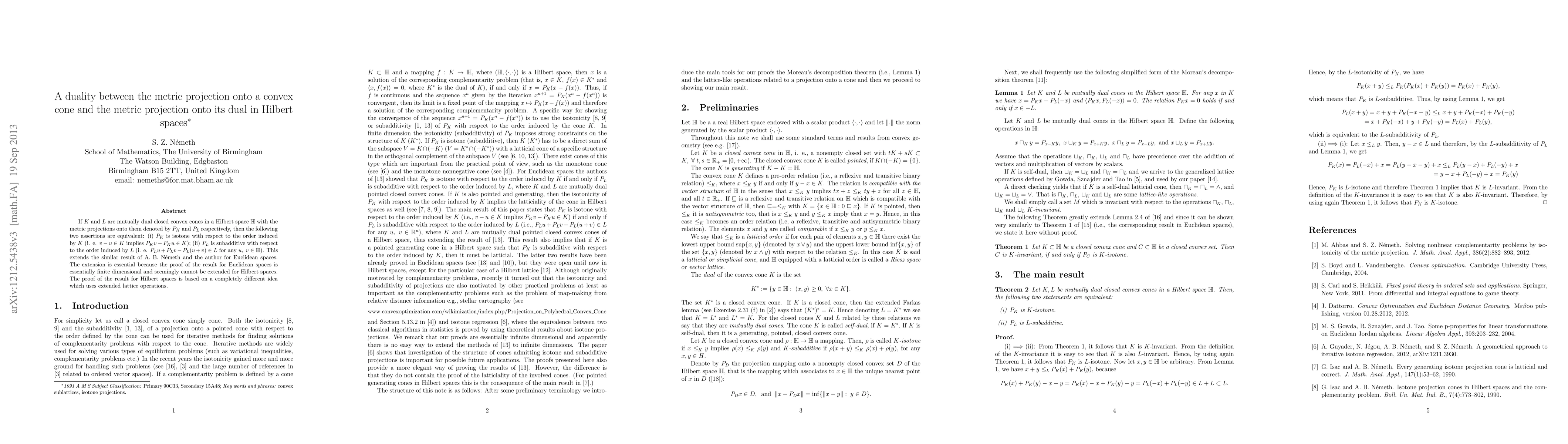 This paper establishes a duality between metric projections onto a convex cone and its dual in Hilbert spaces, showing that the isotonicity of the projection onto the cone is equivalent to the subadditivity of the projection onto its dual. The proof for Hilbert spaces employs extended lattice operations, differing fundamentally from the finite-dimensional Euclidean case.