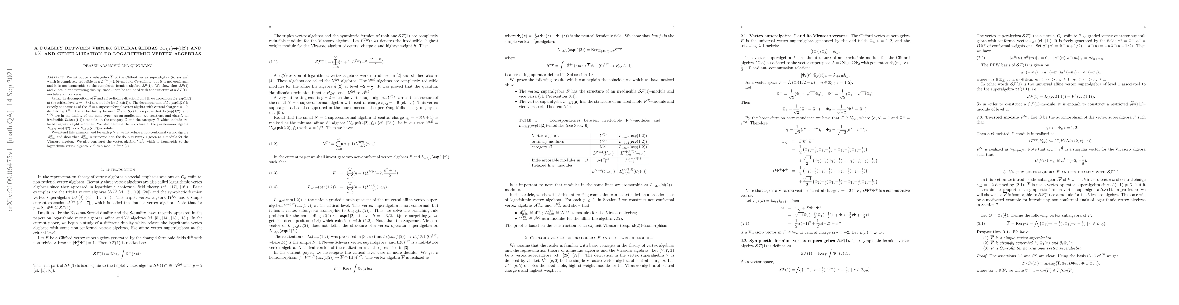 We introduce a subalgebra $\overline F$ of the Clifford vertex superalgebra ($bc$ system) which is completely reducible as a $L^{Vir} (-2,0)$-module, $C_2$-cofinite, but it is not conformal and it is not isomorphic to the symplectic fermion algebra $\mathcal{SF}(1)$. We show that $\mathcal{SF}(1)$ and $\overline{F}$ are in an interesting duality, since $\overline{F}$ can be equipped with the structure of a $\mathcal{SF}(1)$-module and vice versa. Using the decomposition of $\overline F$ and a free-field realization from arXiv:1711.11342, we decompose $L_k(\mathfrak{osp}(1\vert 2))$ at the critical level $k=-3/2$ as a module for $L_k(\mathfrak{sl}(2))$. The decomposition of $L_k(\mathfrak{osp}(1\vert 2))$ is exactly the same as of the $N=4$ superconformal vertex algebra with central charge $c=-9$, denoted by $\mathcal V^{(2)}$. Using the duality between $\overline{F}$ and $\mathcal{SF}(1)$, we prove that $L_k(\mathfrak{osp}(1\vert 2))$ and $\mathcal V^{(2)}$ are in the duality of the same type. As an application, we construct and classify all irreducible $L_k(\mathfrak{osp}(1\vert 2))$-modules in the category $\mathcal O$ and the category $\mathcal R$ which includes relaxed highest weight modules. We also describe the structure of the parafermion algebra $N_{-3/2}(\mathfrak{osp}(1\vert 2))$ as a $N_{-3/2}(\mathfrak{sl}(2))$-module. We extend this example, and for each $p \ge 2$, we introduce a non-conformal vertex algebra $\mathcal A^{(p)}_{new}$ and show that $\mathcal A^{(p)}_{new} $ is isomorphic to the doublet vertex algebra as a module for the Virasoro algebra. We also construct the vertex algebra $ \mathcal V^{(p)} _{new}$ which is isomorphic to the logarithmic vertex algebra $\mathcal V^{(p)}$ as a module for $\widehat{\mathfrak{sl}}(2)$.