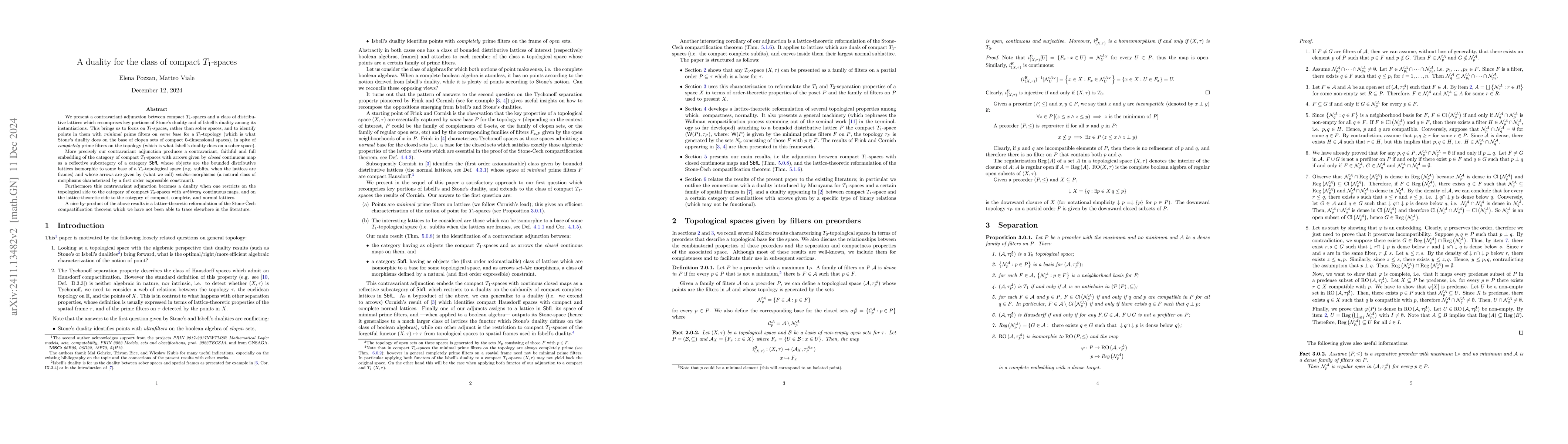 We present a contravariant adjunction between compact $T_1$-spaces and a class of distributive lattices which recomprises key portions of Stone's duality and of Isbell's duality among its instantiations. This brings us to focus on $T_1$-spaces, rather than sober spaces, and to identify points in them with minimal prime filters on some base for a $T_1$-topology (which is what Stone's duality does on the base of clopen sets of compact $0$-dimensional spaces), in spite of completely prime filters on the topology (which is what Isbell's duality does on a sober space). More precisely our contravariant adjunction produces a contravariant, faithful and full embedding of the category of compact $T_1$-spaces with arrows given by closed continuous map as a reflective subcategory of a category $\mathsf{SbfL} $ whose objects are the bounded distributive lattices isomorphic to some base of a $T_1$-topological space (e.g. subfits, when the lattices are frames) and whose arrows are given by (what we call) set-like-morphisms (a natural class of morphisms characterized by a first order expressible constraint). Furthermore this contravariant adjunction becomes a duality when one restricts on the topological side to the category of compact $T_2$-spaces with arbitrary continuous maps, and on the lattice-theoretic side to the category of compact, complete, and normal lattices. A nice by-product of the above results is a lattice-theoretic reformulation of the Stone-\v{C}ech compactification theorem which we have not been able to trace elsewhere in the literature.