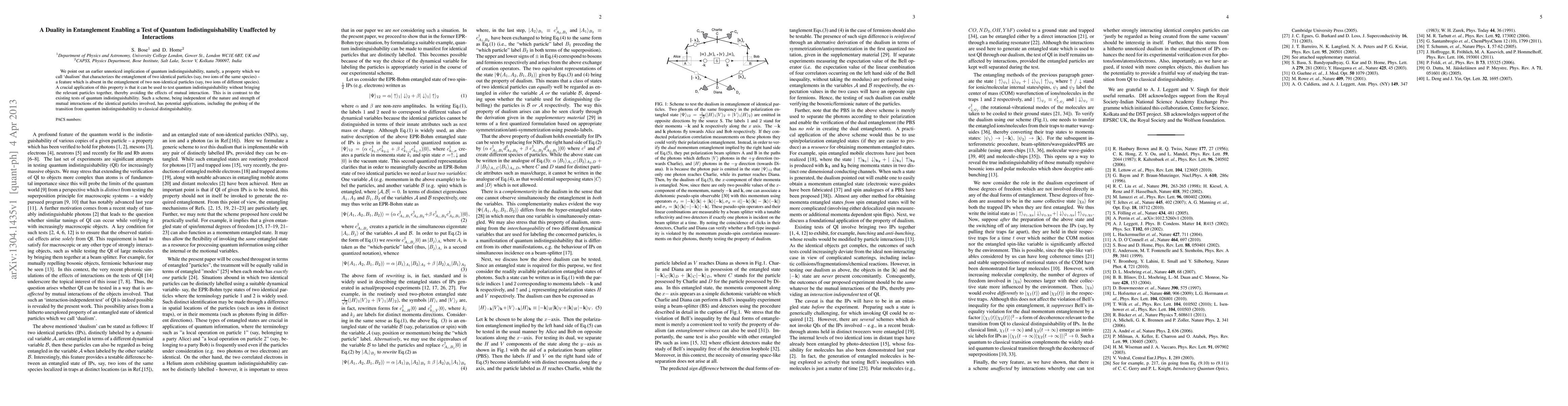 We point out an earlier unnoticed implication of quantum indistinguishability, namely, a property which we call `dualism' that characterizes the entanglement of two identical particles (say, two ions of the same species) -- a feature which is absent in the entanglement of two non-identical particles (say, two ions of different species). A crucial application of this property is that it can be used to test quantum indistinguishability without bringing the relevant particles together, thereby avoiding the effects of mutual interaction. This is in contrast to the existing tests of quantum indistinguishability. Such a scheme, being independent of the nature and strength of mutual interactions of the identical particles involved, has potential applications, including the probing of the transition from quantum indistinguishability to classical distinguishability.