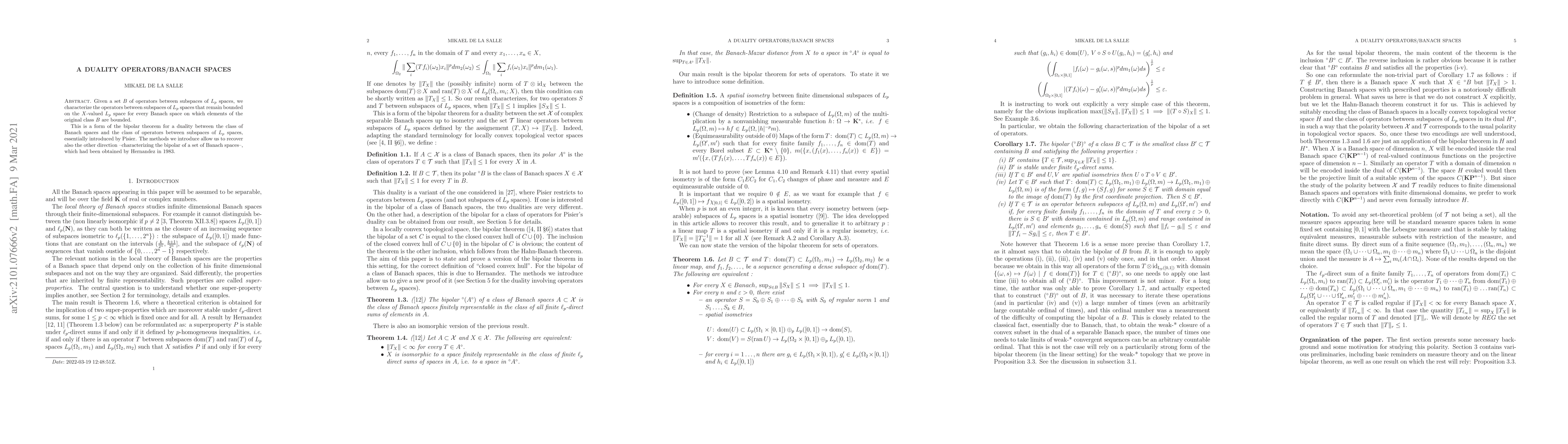 Given a set $B$ of operators between subspaces of $L_p$ spaces, we characterize the operators between subspaces of $L_p$ spaces that remain bounded on the $X$-valued $L_p$ space for every Banach space on which elements of the original class $B$ are bounded. This is a form of the bipolar theorem for a duality between the class of Banach spaces and the class of operators between subspaces of $L_p$ spaces, essentially introduced by Pisier. The methods we introduce allow us to recover also the other direction --characterizing the bipolar of a set of Banach spaces--, which had been obtained by Hernandez in 1983.