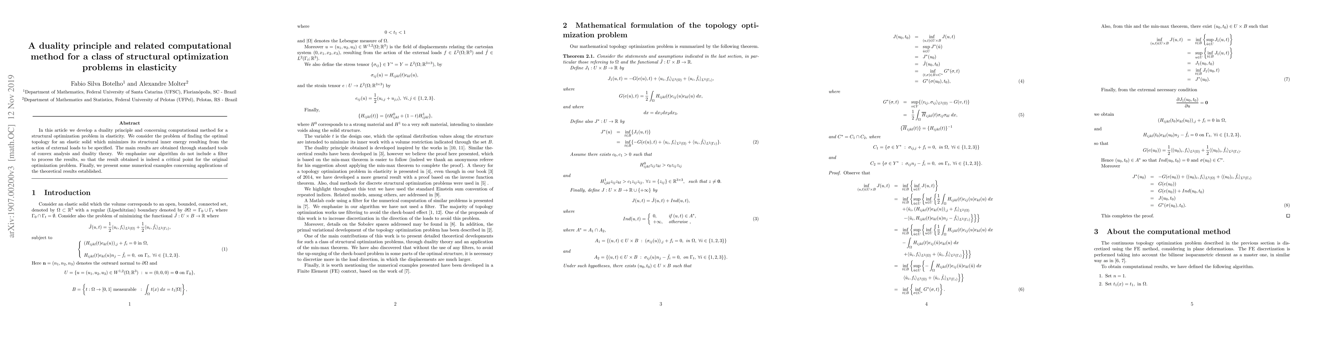 In this article we develop a duality principle and concerning computational method for a structural optimization problem in elasticity. We consider the problem of finding the optimal topology for an elastic solid which minimizes its structural inner energy resulting from the action of external loads to be specified. The main results are obtained through standard tools of convex analysis and duality theory. We emphasize our algorithm do not include a filter to process the results, so that the result obtained is indeed a critical point for the original optimization problem. Finally, we present some numerical examples concerning applications of the theoretical results established.