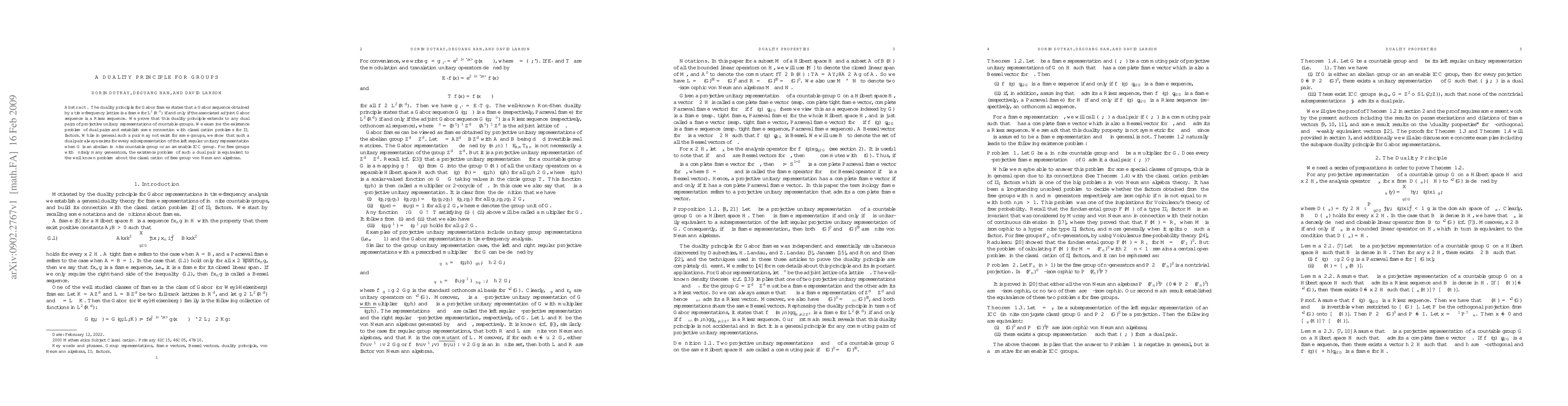 The duality principle for Gabor frames states that a Gabor sequence obtained by a time-frequency lattice is a frame for $L^{2}(\R^{d})$ if and only if the associated adjoint Gabor sequence is a Riesz sequence. We prove that this duality principle extends to any dual pairs of projective unitary representations of countable groups. We examine the existence problem of dual pairs and establish some connection with classification problems for $\rm II_{1}$ factors. While in general such a pair may not exist for some groups, we show that such a dual pair always exists for every subrepresentation of the left regular unitary representation when $G$ is an abelian infinite countable group or an amenable ICC group. For free groups with finitely many generators, the existence problem of such a dual pair is equivalent to the well known problem about the classification of free group von Neumann algebras.