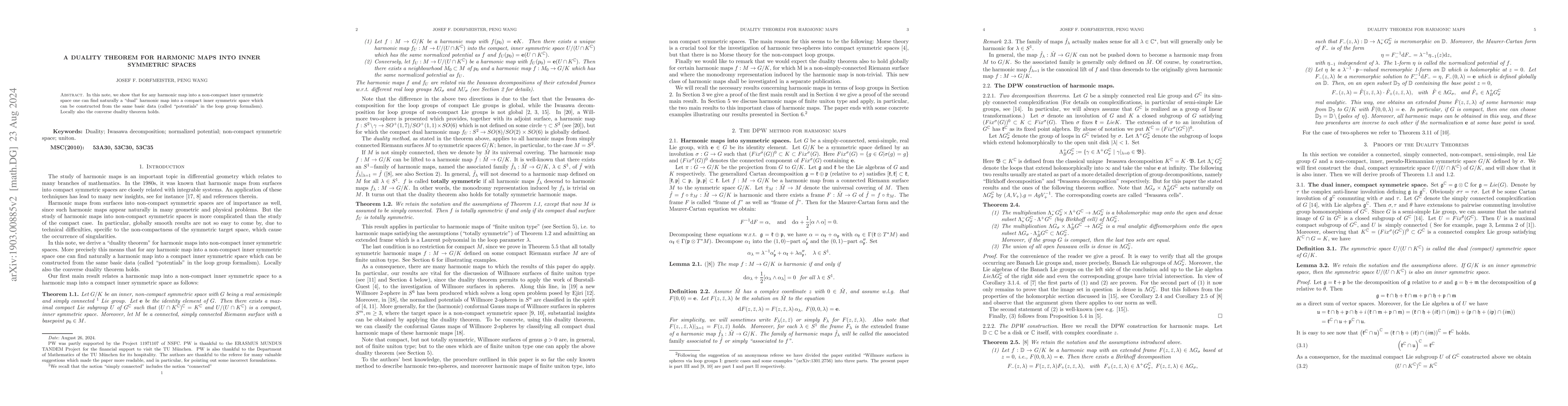 Summary: This paper establishes a duality theorem for harmonic maps, demonstrating that a harmonic map into a non-compact symmetric space has a corresponding "dual" harmonic map into a compact symmetric space, constructed from identical "potentials" in loop group formalism, with a locally valid inverse/converse duality theorem.