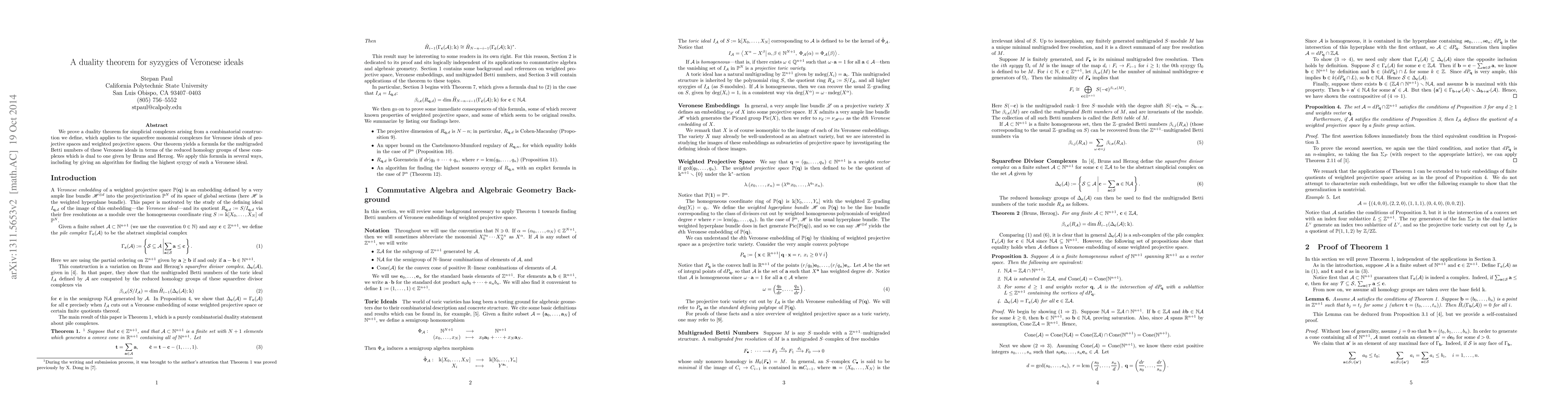 This research establishes a duality theorem for simplicial complexes linked to Veronese ideals in projective spaces and weighted projective spaces, offering a formula for multigraded Betti numbers. The formula, dual to Bruns and Herzog's, aids in determining the highest syzygy of Veronese ideals via an algorithm.