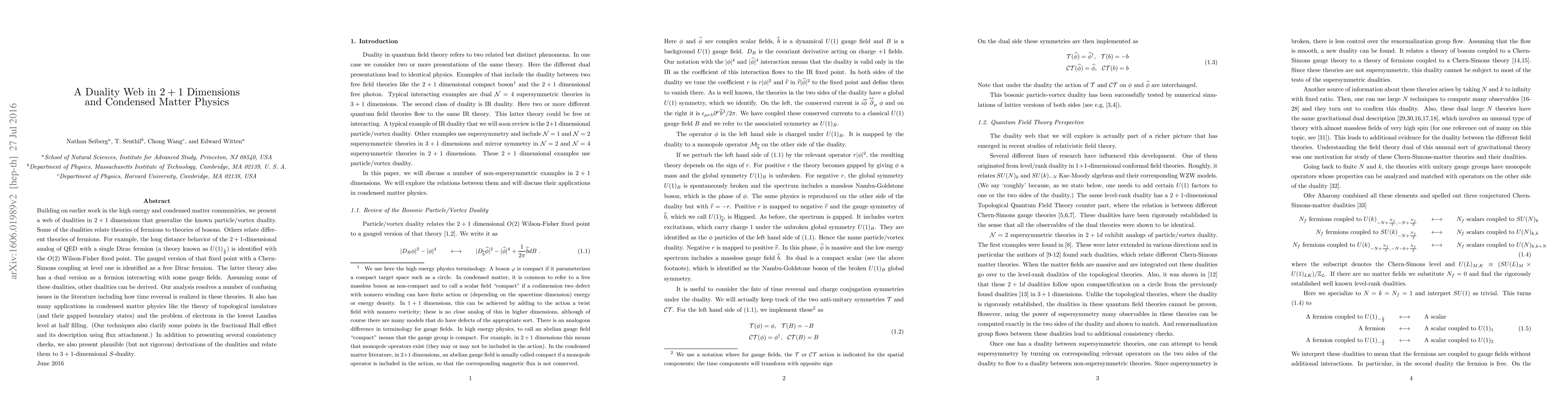 This paper explores a web of dualities in $2+1$ dimensions, extending particle/vortex duality and relating fermionic and bosonic theories. It resolves confusions in the literature and has applications in condensed matter physics, including topological insulators and fractional Hall effect.