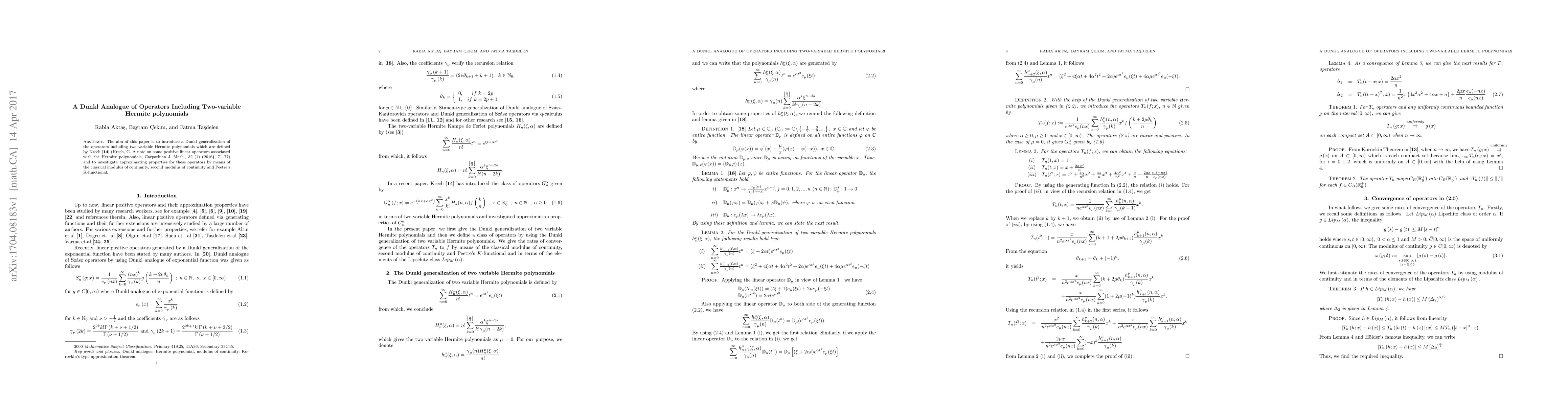 This paper introduces a Dunkl analogue of operators associated with two-variable Hermite polynomials, exploring their approximating properties using classical continuity measures and Peetre's K-functional. The study extends previous work by Krech on positive linear operators linked to Hermite polynomials.