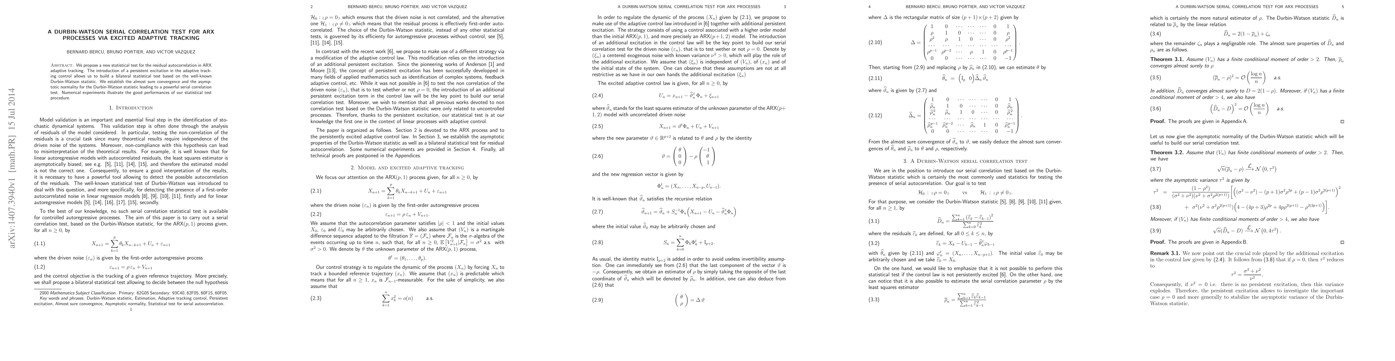 This paper introduces a new statistical test for residual autocorrelation in ARX adaptive tracking using a persistent excitation-based Durbin-Watson statistic. The proposed test demonstrates almost sure convergence and asymptotic normality, validated by numerical experiments showing its effectiveness.