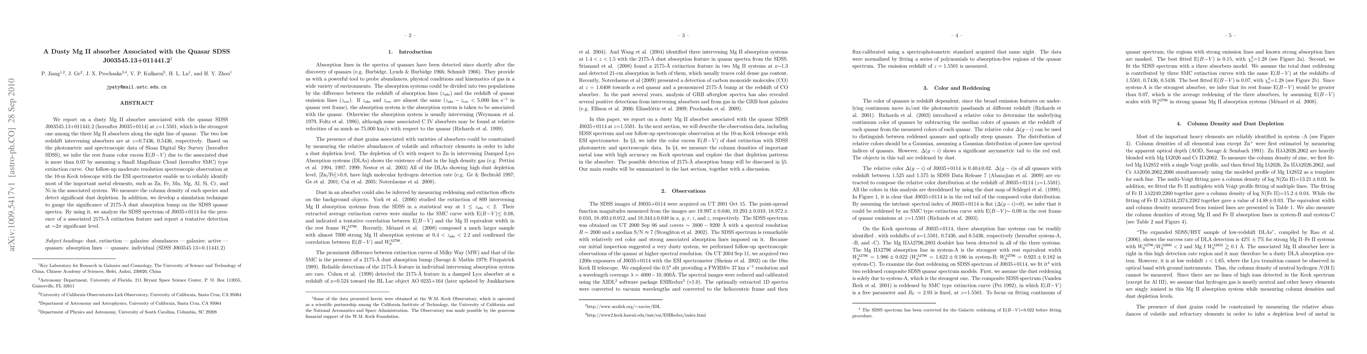 We report on a dusty Mg~II absorber associated with the quasar SDSSJ003545.13+011441.2 (hereafter J0035+0114) at $z$=1.5501, which is the strongest one among the three Mg~II absorbers along the sight line of quasar. The two low redshift intervening absorbers are at $z$=0.7436, 0.5436, respectively. Based on the photometric and spectroscopic data of Sloan Digital Sky Survey (hereafter SDSS), we infer the rest frame color excess E(\bv) due to the associated dust is more than 0.07 by assuming a Small Magellanic Cloud (hereafter SMC) type extinction curve. Our follow-up moderate resolution spectroscopic observation at the 10-m Keck telescope with the ESI spectrometer enable us to reliably identify most of the important metal elements, such as Zn, Fe, Mn, Mg, Al, Si, Cr, and Ni in the associated system. We measure the column density of each species and detect significant dust depletion. In addition, we develop a simulation technique to gauge the significance of 2175-{\AA} dust absorption bump on the SDSS quasar spectra. By using it, we analyze the SDSS spectrum of J0035+0114 for the presence of a associated 2175-{\AA} extinction feature and report a tentative detection at $\sim$2$\sigma$ significant level.