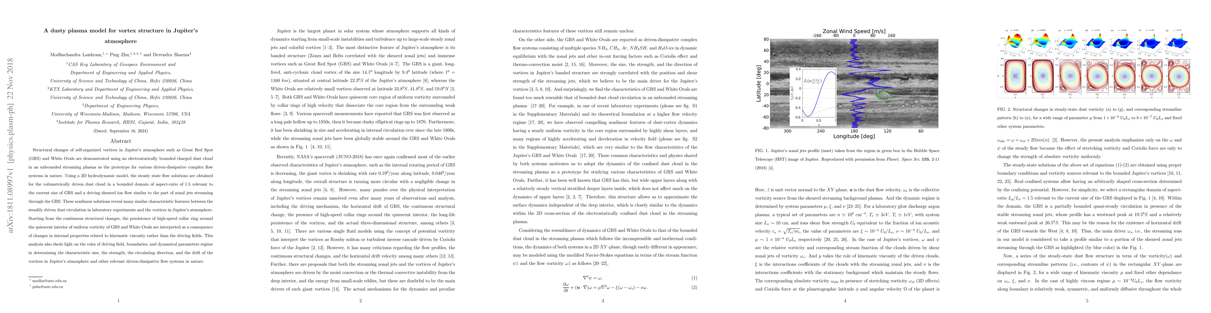 Structural changes of self-organized vortices in Jupiter atmospheres such as Great Red Spot (GRS) and White Ovals are demonstrated using an electrostatically bounded charged dust cloud in an unbounded streaming plasma as the prototype for various driven-dissipative complex flow systems in nature. Using a 2D hydrodynamic model, the steady state flow solutions are obtained for the volumetrically driven dust cloud in a bounded domain of aspect-ratio of 1.5 relevant to the current size of GRS and a driving sheared ion flow similar to the part of zonal jets streaming through the GRS. These nonlinear solutions reveal many similar characteristic features between the steadily driven dust circulation in laboratory experiments and the vortices in Jupiter atmosphere. Starting from the continuous structural changes, the persistence of high-speed collar ring around the quiescent interior of uniform vorticity of GRS and White Ovals are interpreted as a consequence of changes in internal properties related to kinematic viscosity rather than the driving fields. This the analysis also sheds light on the roles of driving field, boundaries, and dynamical parameters regime in determining the characteristic size, the strength, the circulating direction, and the drift of the vortices in Jupiter atmosphere and other relevant driven-dissipative flow systems in nature.