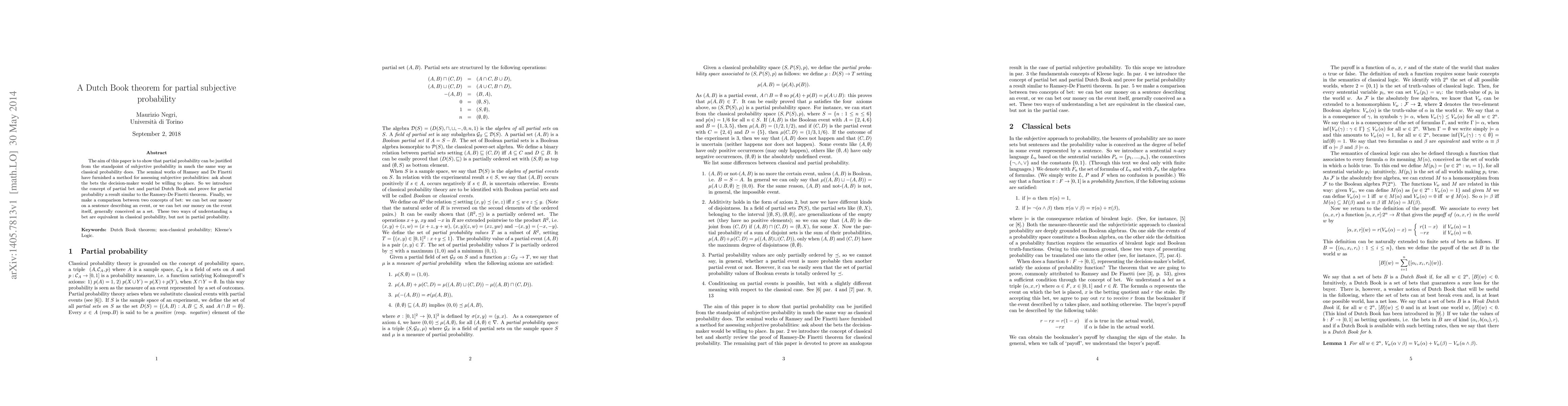 This paper establishes a Dutch Book theorem for partial subjective probability, showing that it can be justified similarly to classical probability through decision-maker bets. It also explores the equivalence of two concepts of bet in classical vs. partial probability.