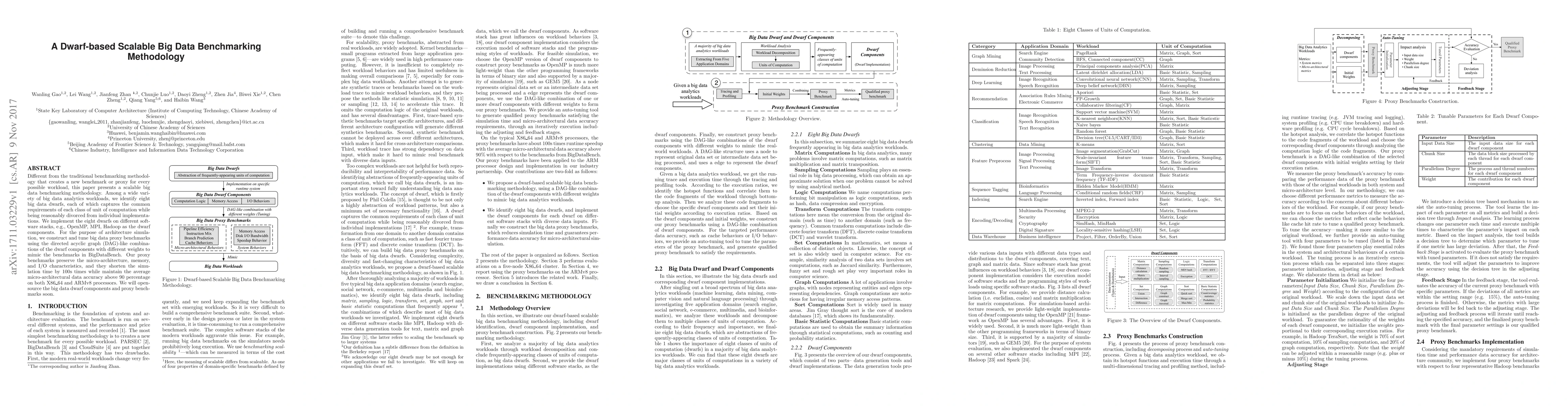 This paper introduces a scalable big data benchmarking methodology using eight "big data dwarfs" that represent common computational requirements across various workloads. These dwarfs are implemented across different software stacks and used to create proxy benchmarks that mimic complex workloads while significantly reducing simulation time and maintaining accuracy.