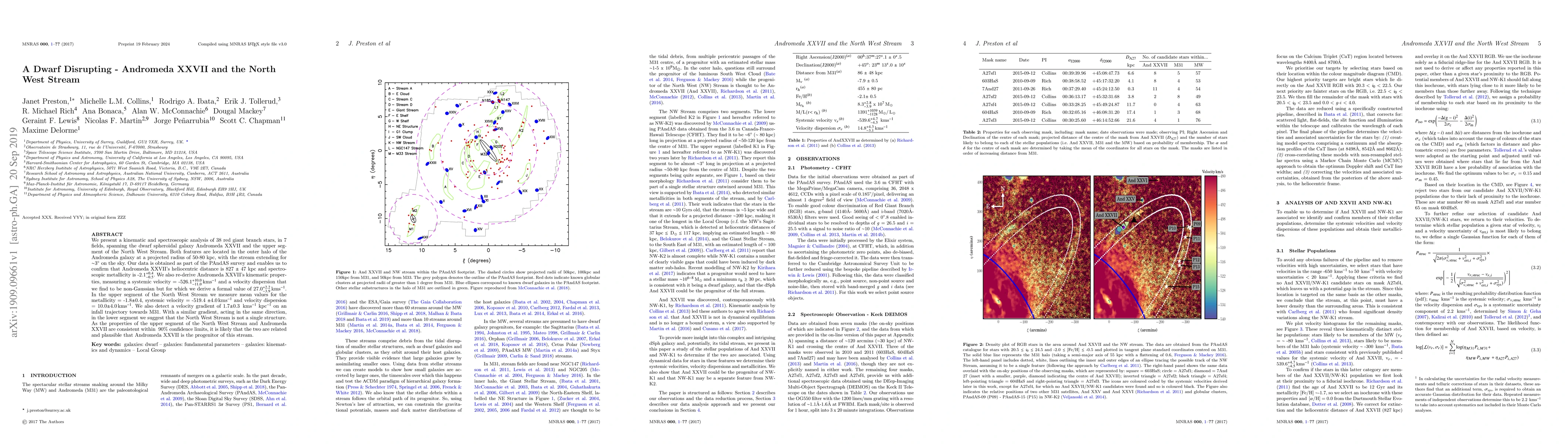 This paper analyzes the kinematic and spectroscopic properties of stars in Andromeda XXVII and the North West Stream, finding that Andromeda XXVII is likely the progenitor of the stream. The study confirms Andromeda XXVII's distance and metallicity, and detects a velocity gradient suggesting the stream's infall towards M31.