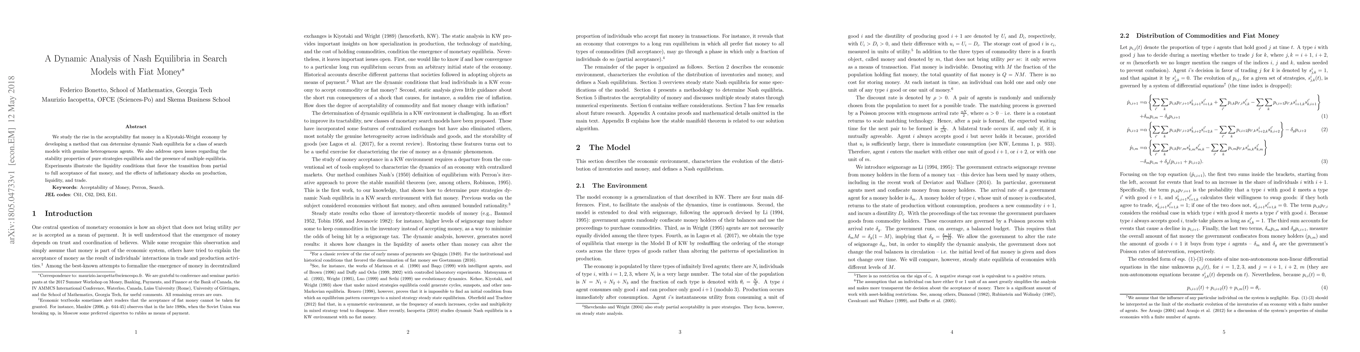 We study the rise in the acceptability fiat money in a Kiyotaki-Wright economy by developing a method that can determine dynamic Nash equilibria for a class of search models with genuine heterogenous agents. We also address open issues regarding the stability properties of pure strategies equilibria and the presence of multiple equilibria. Experiments illustrate the liquidity conditions that favor the transition from partial to full acceptance of fiat money, and the effects of inflationary shocks on production, liquidity, and trade.