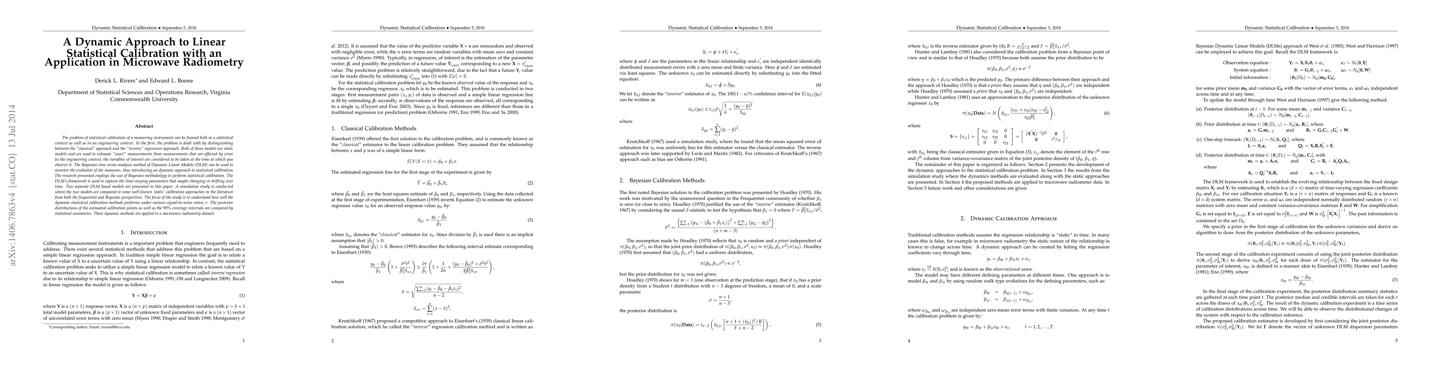 The problem of statistical calibration of a measuring instrument can be framed both in a statistical context as well as in an engineering context. In the first, the problem is dealt with by distinguishing between the 'classical' approach and the 'inverse' regression approach. Both of these models are static models and are used to estimate exact measurements from measurements that are affected by error. In the engineering context, the variables of interest are considered to be taken at the time at which you observe it. The Bayesian time series analysis method of Dynamic Linear Models (DLM) can be used to monitor the evolution of the measures, thus introducing an dynamic approach to statistical calibration. The research presented employs the use of Bayesian methodology to perform statistical calibration. The DLM's framework is used to capture the time-varying parameters that maybe changing or drifting over time. Two separate DLM based models are presented in this paper. A simulation study is conducted where the two models are compared to some well known 'static' calibration approaches in the literature from both the frequentist and Bayesian perspectives. The focus of the study is to understand how well the dynamic statistical calibration methods performs under various signal-to-noise ratios, r. The posterior distributions of the estimated calibration points as well as the 95% coverage intervals are compared by statistical summaries. These dynamic methods are applied to a microwave radiometry data set.