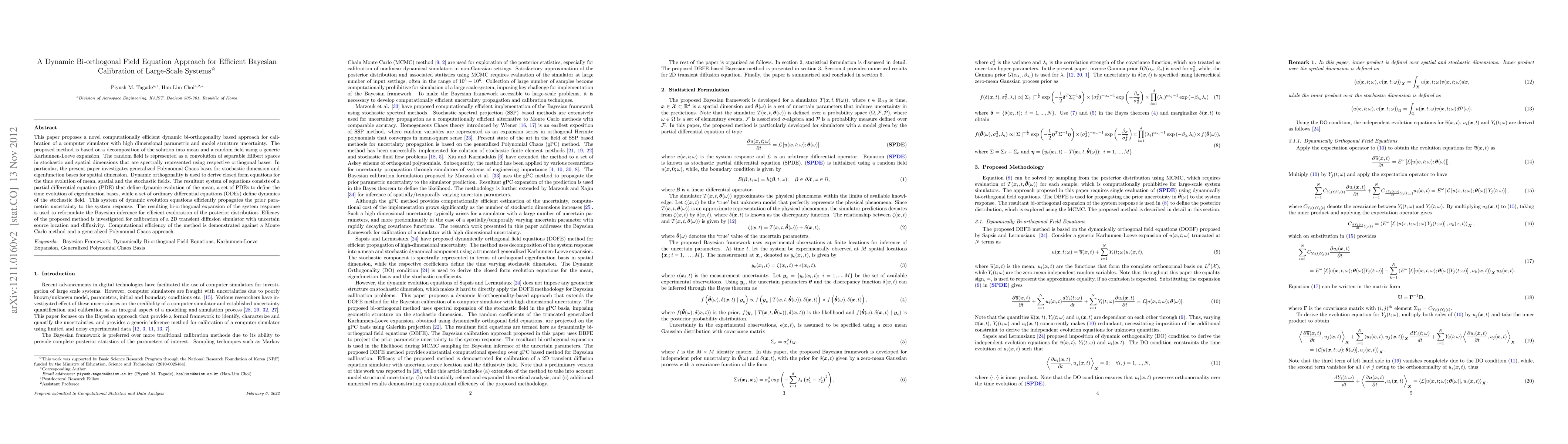 This paper introduces a dynamic bi-orthogonal field equation approach for efficient Bayesian calibration of large-scale systems with high dimensional uncertainties. The method decomposes the solution into mean and random fields using Karhunen-Loeve expansion and spectral representations, demonstrating computational efficiency through comparisons with Monte Carlo and polynomial chaos methods.