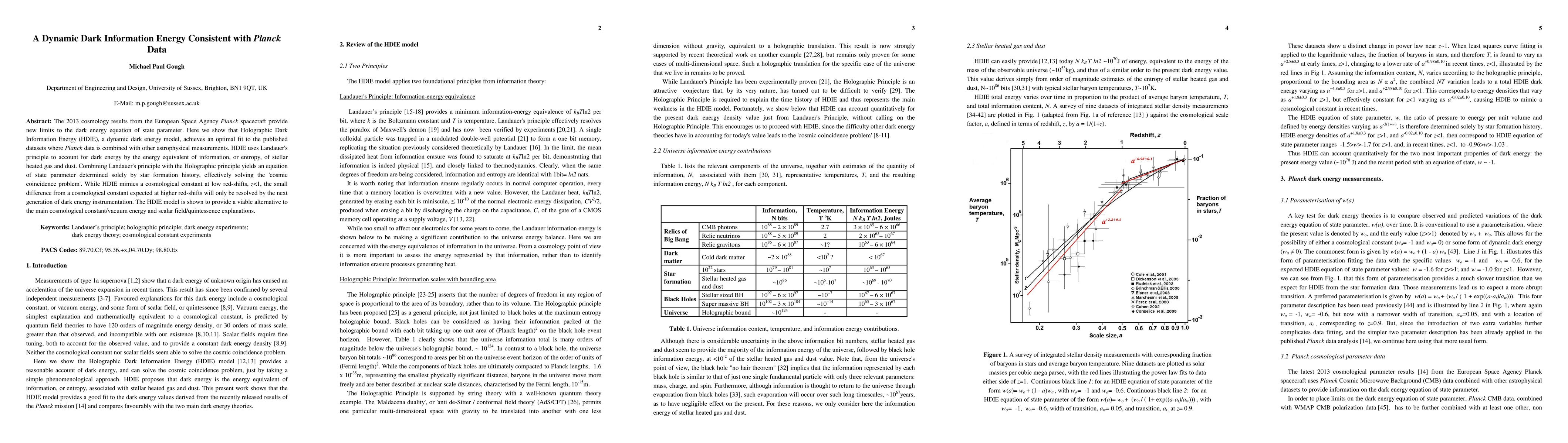 The 2013 cosmology results from the European Space Agency Planck spacecraft provide new limits to the dark energy equation of state parameter. Here we show that Holographic Dark Information Energy (HDIE), a dynamic dark energy model, achieves an optimal fit to the published datasets where Planck data is combined with other astrophysical measurements. HDIE uses Landauer's principle to account for dark energy by the energy equivalent of information, or entropy, of stellar heated gas and dust. Combining Landauer's principle with the Holographic principle yields an equation of state parameter determined solely by star formation history, effectively solving the 'cosmic coincidence problem'. While HDIE mimics a cosmological constant at low red-shifts, z<1, the small difference from a cosmological constant expected at higher red-shifts will only be resolved by the next generation of dark energy instrumentation. The HDIE model is shown to provide a viable alternative to the main cosmological constant/vacuum energy and scalar field/quintessence explanations.