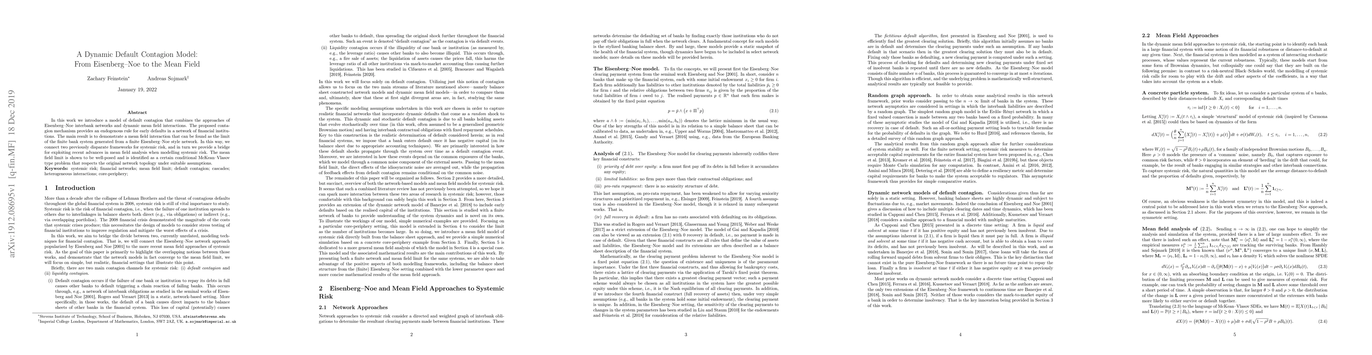 This paper presents a dynamic default contagion model that merges Eisenberg-Noe interbank network theory with dynamic mean field interactions, providing an endogenous rule for early defaults. It demonstrates a mean field limit that connects two disparate systemic risk frameworks and utilizes recent mean field analysis advancements.
