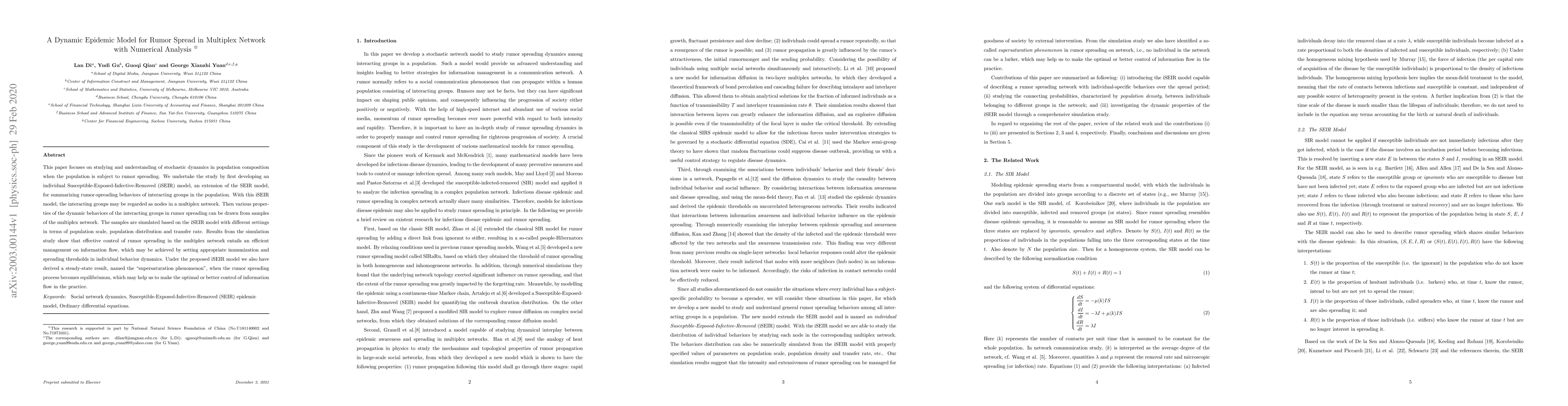 This paper focuses on studying and understanding of stochastic dynamics in population composition when the population is subject to rumor spreading. We undertake the study by first developing an individual Susceptible-Exposed-Infectious-Removed (iSEIR) model, an extension of the SEIR model, for summarizing rumor-spreading behaviors of interacting groups in the population. With this iSEIR model, the interacting groups may be regarded as nodes in a multiplex network. Then various properties of the dynamic behaviors of the interacting groups in rumor spreading can be drawn from samples of the multiplex network. The samples are simulated based on the iSEIR model with different settings in terms of population scale, population distribution and transfer rate. Results from the simulation study show that effective control of rumor spreading in the multiplex network entails an efficient management on information flow, which may be achieved by setting appropriate immunization and spreading thresholds in individual behavior dynamics. Under the proposed iSEIR model we also have derived a steady-state result, named the "supersaturation phenomenon", when the rumor spreading process becomes equilibrium, which may help us to make the optimal or better control of information flow in the practice.