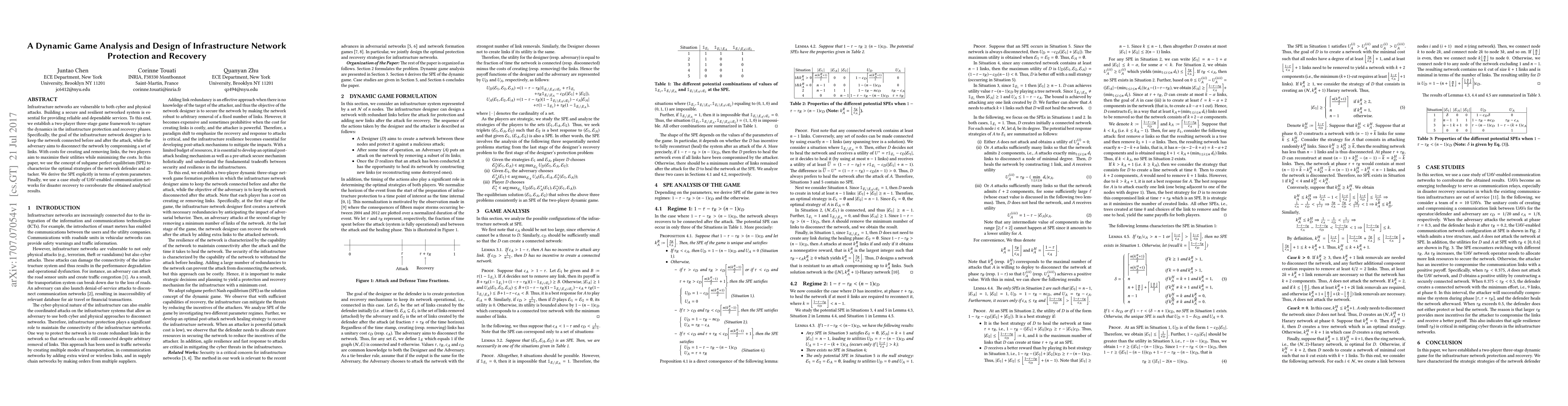 This paper develops a dynamic game framework to analyze infrastructure network protection and recovery, focusing on the interactions between network designers and attackers. It uses subgame perfect equilibrium to determine optimal strategies for both parties, and validates the model through a case study on UAV-enabled communication networks for disaster recovery.