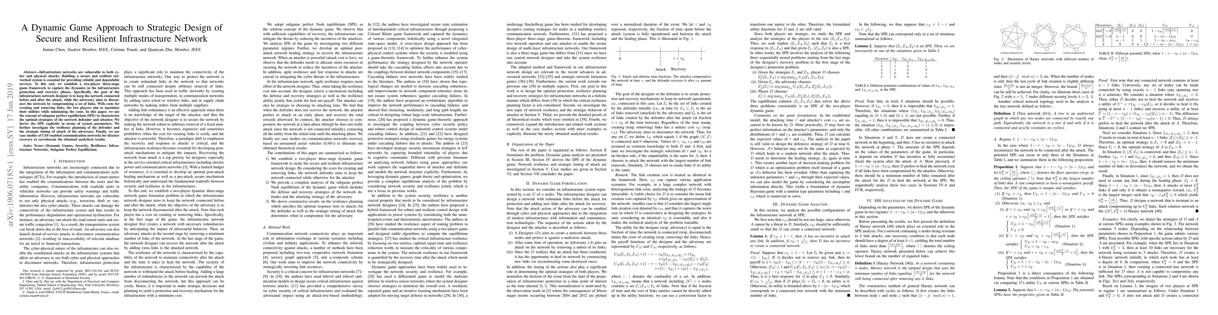 This paper develops a dynamic game framework to strategically design secure and resilient infrastructure networks, focusing on the interactions between network defenders and attackers. It uses subgame perfect equilibrium to determine optimal strategies and examines resilience planning and strategic timing of attacks, validated through case studies on UAV-enabled communication networks.