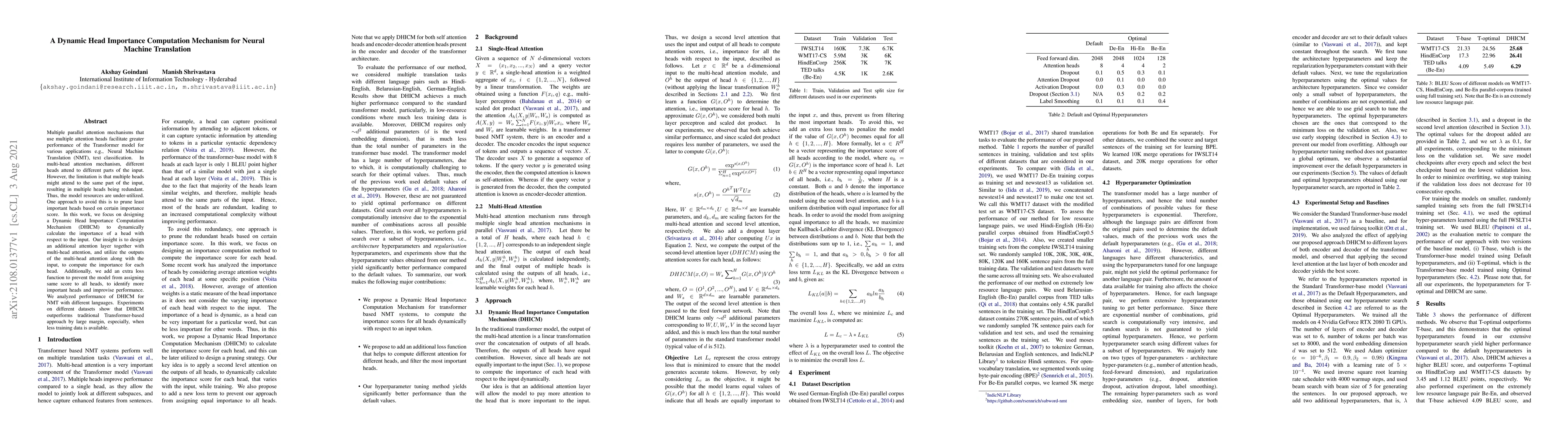 Multiple parallel attention mechanisms that use multiple attention heads facilitate greater performance of the Transformer model for various applications e.g., Neural Machine Translation (NMT), text classification. In multi-head attention mechanism, different heads attend to different parts of the input. However, the limitation is that multiple heads might attend to the same part of the input, resulting in multiple heads being redundant. Thus, the model resources are under-utilized. One approach to avoid this is to prune least important heads based on certain importance score. In this work, we focus on designing a Dynamic Head Importance Computation Mechanism (DHICM) to dynamically calculate the importance of a head with respect to the input. Our insight is to design an additional attention layer together with multi-head attention, and utilize the outputs of the multi-head attention along with the input, to compute the importance for each head. Additionally, we add an extra loss function to prevent the model from assigning same score to all heads, to identify more important heads and improvise performance. We analyzed performance of DHICM for NMT with different languages. Experiments on different datasets show that DHICM outperforms traditional Transformer-based approach by large margin, especially, when less training data is available.