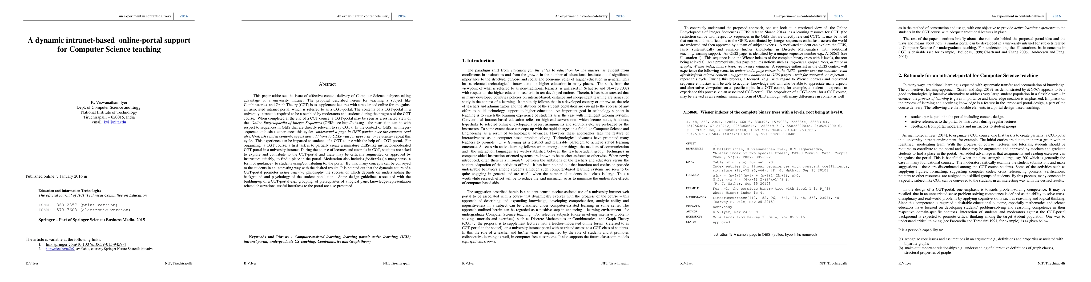 The paper is a suggested experiment in effectively teaching subjects in Computer Science. The paper addresses effective content-delivery with the help of a university intranet. The proposal described herein is for teaching a subject like Combinatorics and Graph Theory - the main idea is to supplement lectures with a teacher-moderated online forum against an associated intranet portal. Keywords and phrases -computer-assisted learning; learning portal; active learning; OEIS; intranet portal; undergraduate teaching; Combinatorics and Graph theory