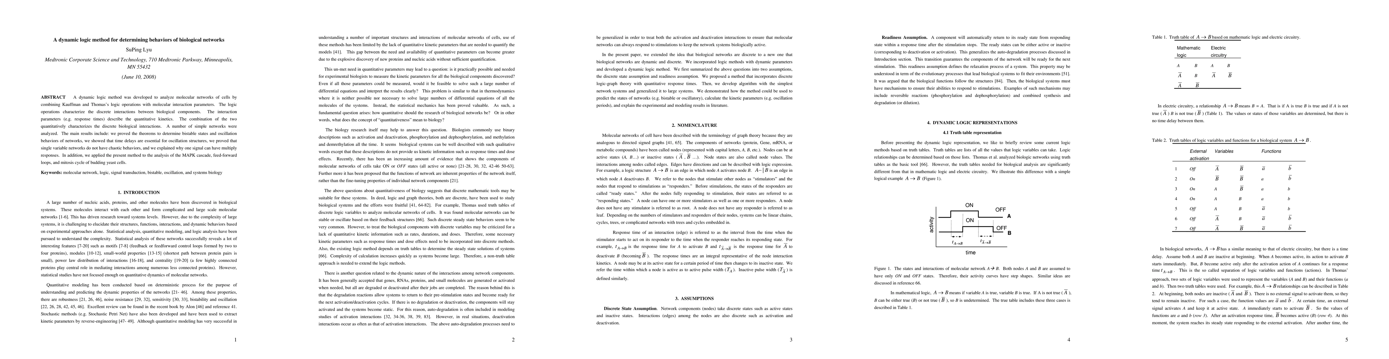 A dynamic logic method was developed to analyze molecular networks of cells by combining Kauffman and Thomas's logic operations with molecular interaction parameters. The logic operations characterize the discrete interactions between biological components. The interaction parameters (e.g. response times) describe the quantitative kinetics. The combination of the two quantitatively characterizes the discrete biological interactions. A number of simple networks were analyzed. The main results include: we proved the theorems to determine bistable states and oscillation behaviors of networks, we showed that time delays are essential for oscillation structures, we proved that single variable networks do not have chaotic behaviors, and we explained why one signal can have multiply responses. In addition, we applied the present method to the analysis of the MAPK cascade, feed-forward loops, and mitosis cycle of budding yeast cells.