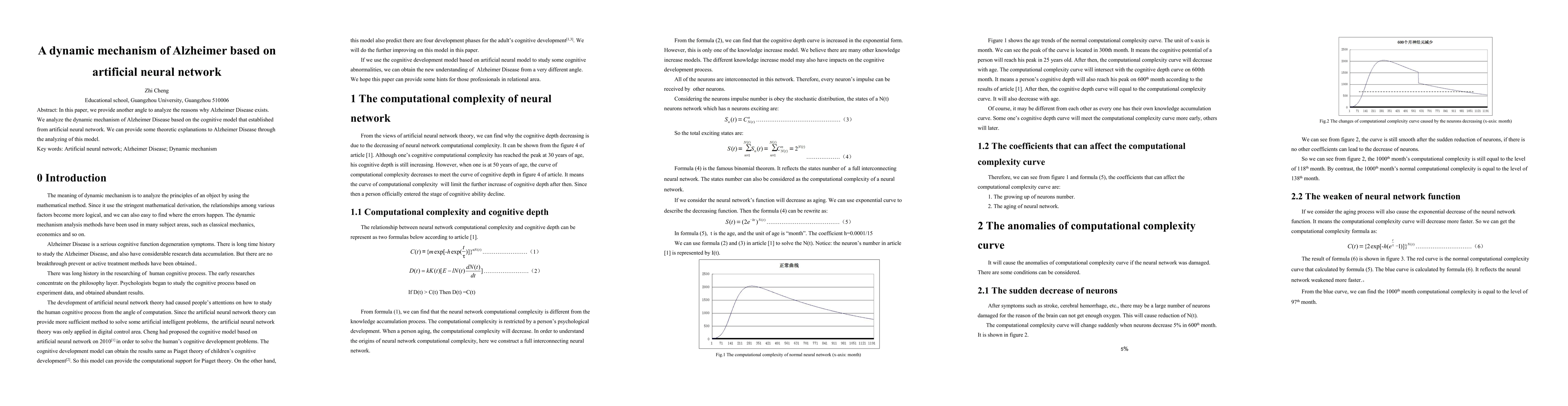 This paper explores the dynamic mechanism behind Alzheimer's Disease using an artificial neural network-based cognitive model, offering theoretical insights into the disease's underlying causes. The study aims to provide a novel perspective on Alzheimer's through computational analysis.