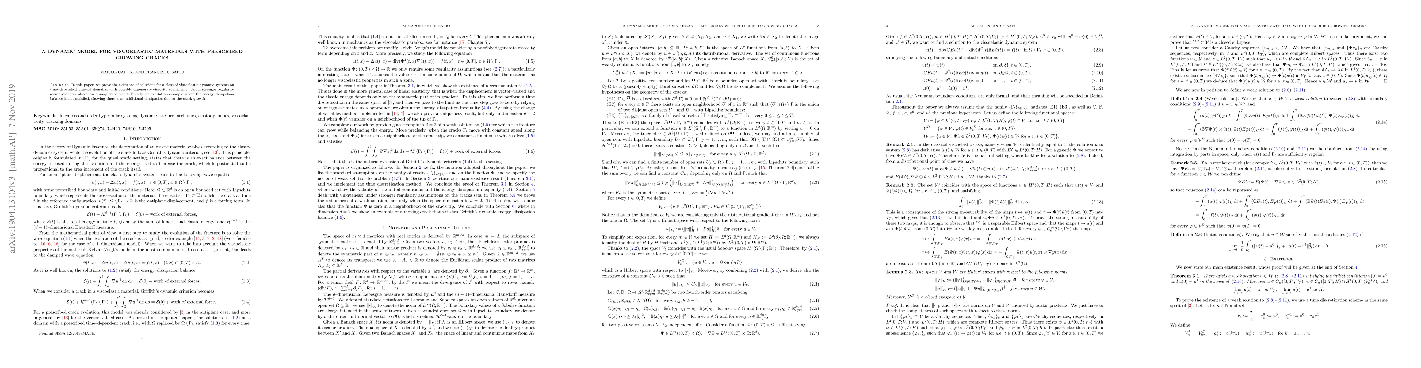 In this paper we prove the existence of solutions for a class of viscoelastic dynamic systems on time--dependent cracked domains, with possibly degenerate viscosity coefficients. Under stronger regularity assumptions we also show a uniqueness result. Finally, we exhibit an example where the energy--dissipation balance is not satisfied, showing there is an additional dissipation due to the crack growth.