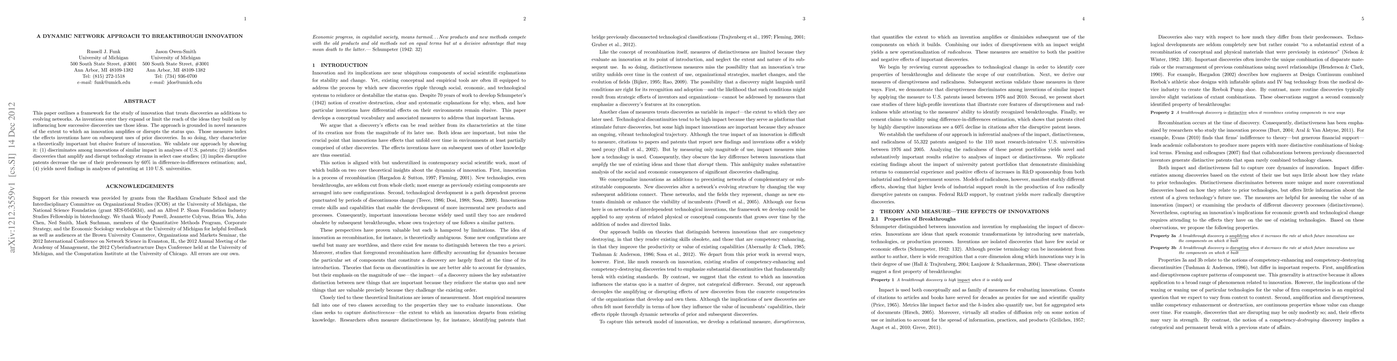 This paper outlines a framework for the study of innovation that treats discoveries as additions to evolving networks. As inventions enter they expand or limit the reach of the ideas they build on by influencing how successive discoveries use those ideas. The approach is grounded in novel measures of the extent to which an innovation amplifies or disrupts the status quo. Those measures index the effects inventions have on subsequent uses of prior discoveries. In so doing, they characterize a theoretically important but elusive feature of innovation. We validate our approach by showing it: (1) discriminates among innovations of similar impact in analyses of U.S. patents; (2) identifies discoveries that amplify and disrupt technology streams in select case studies; (3) implies disruptive patents decrease the use of their predecessors by 60% in difference-in-differences estimation; and, (4) yields novel findings in analyses of patenting at 110 U.S. universities.