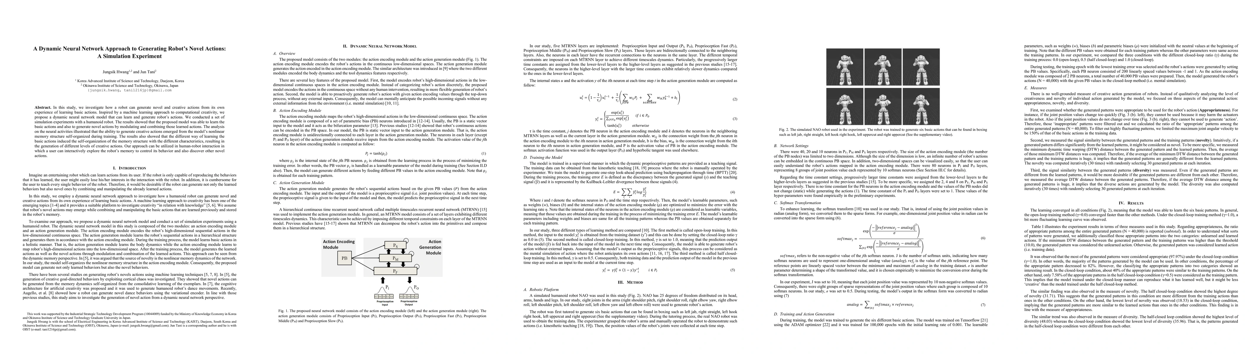 This study proposes a dynamic neural network model to enable a robot to generate novel actions by learning and combining basic actions from its own experience. Simulation experiments with a humanoid robot demonstrated that the model successfully learned basic actions and generated creative novel actions, highlighting the role of the model's self-organized nonlinear memory structure in fostering creativity.