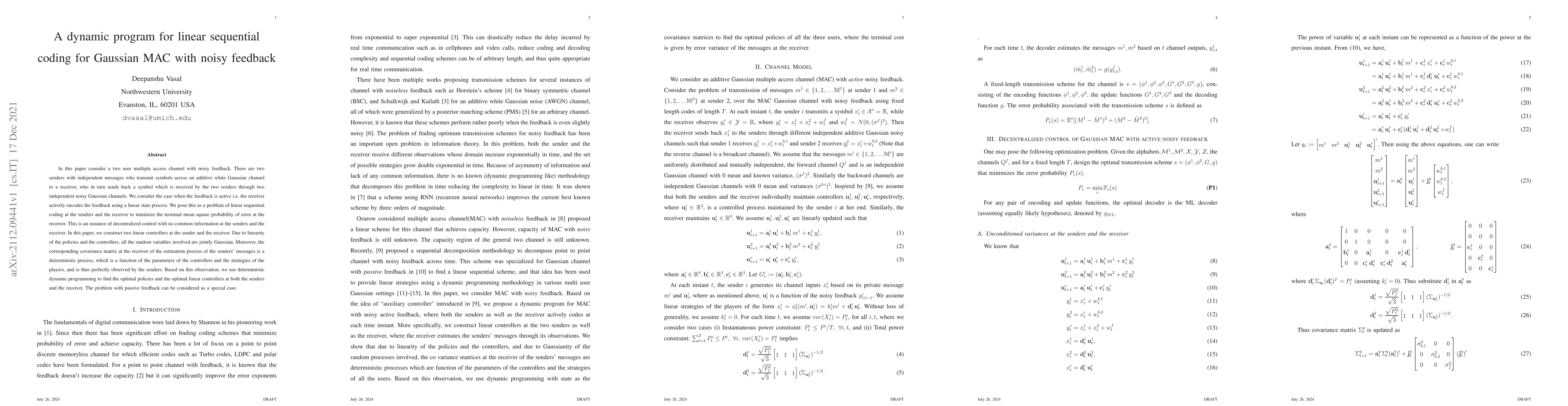 Researchers developed a dynamic program for linear sequential coding in a two-user multiple access channel with noisy feedback, using deterministic dynamic programming to find optimal policies and controllers.
