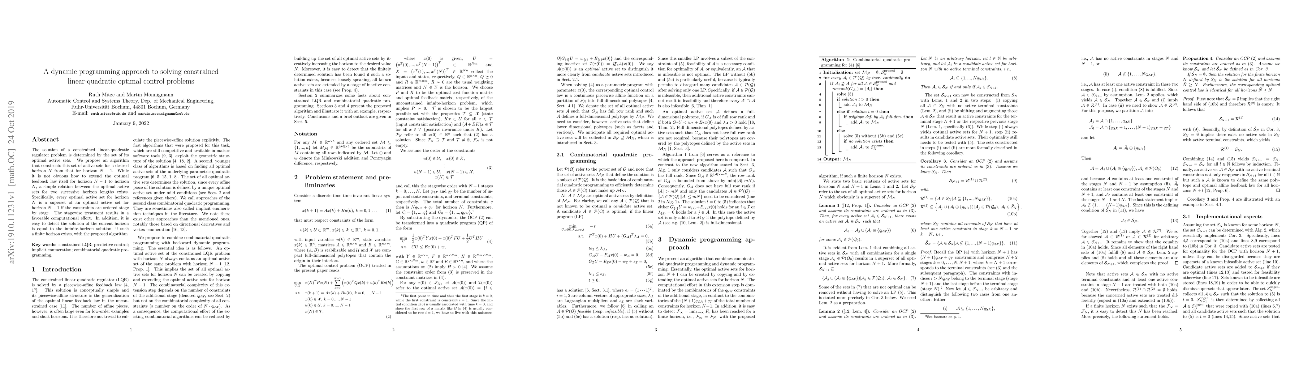Researchers propose an algorithm to extend linear-quadratic optimal control problems from horizon N-1 to horizon N, leveraging the relationship between optimal active sets for consecutive horizons.