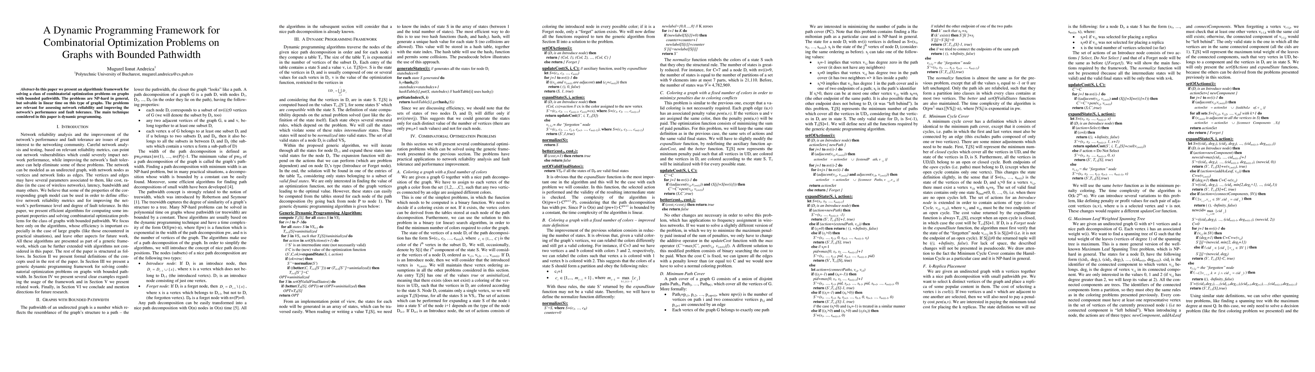 This paper introduces a dynamic programming framework for solving NP-hard combinatorial optimization problems on graphs with bounded pathwidth in linear time, relevant for network reliability and performance enhancement. The key technique utilized is dynamic programming.