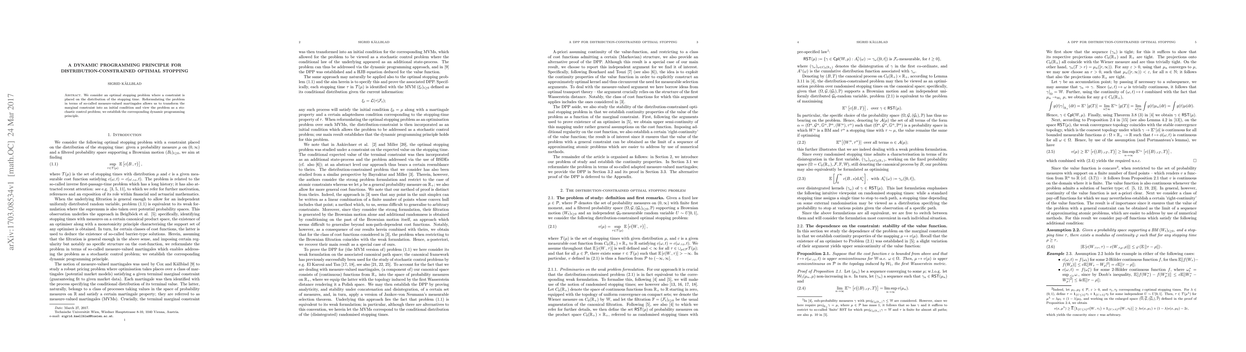 This paper addresses an optimal stopping problem with a distribution constraint on the stopping time, reformulating it using measure-valued martingales to convert the constraint into an initial condition. It establishes a dynamic programming principle for this stochastic control problem.