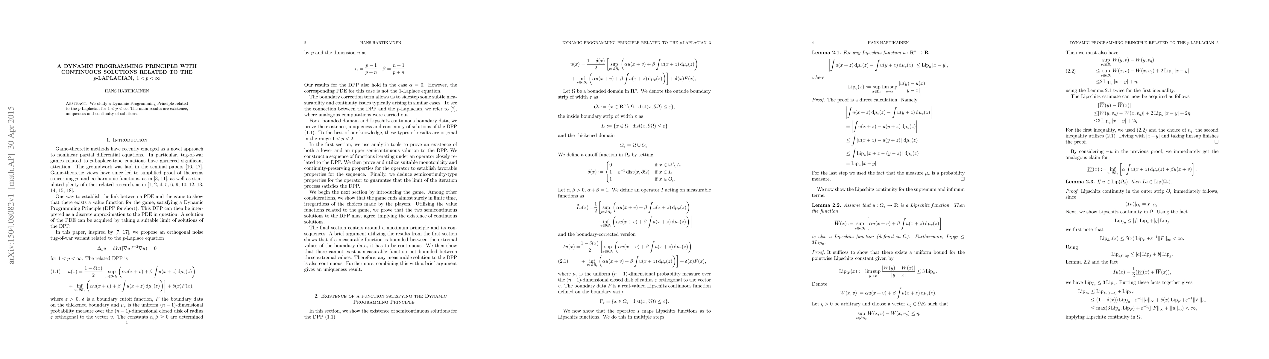 Summary: This paper investigates a Dynamic Programming Principle connected to the $p$-Laplacian for $1 < p < \infty$, establishing the existence, uniqueness, and continuity of its solutions.