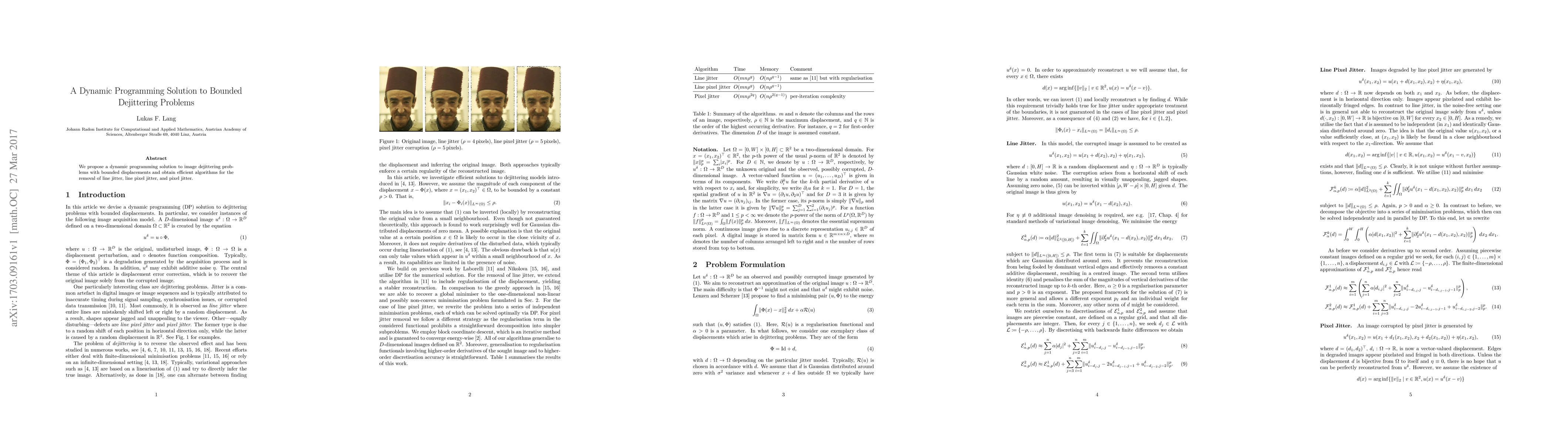 We propose a dynamic programming solution to image dejittering problems with bounded displacements and obtain efficient algorithms for the removal of line jitter, line pixel jitter, and pixel jitter.