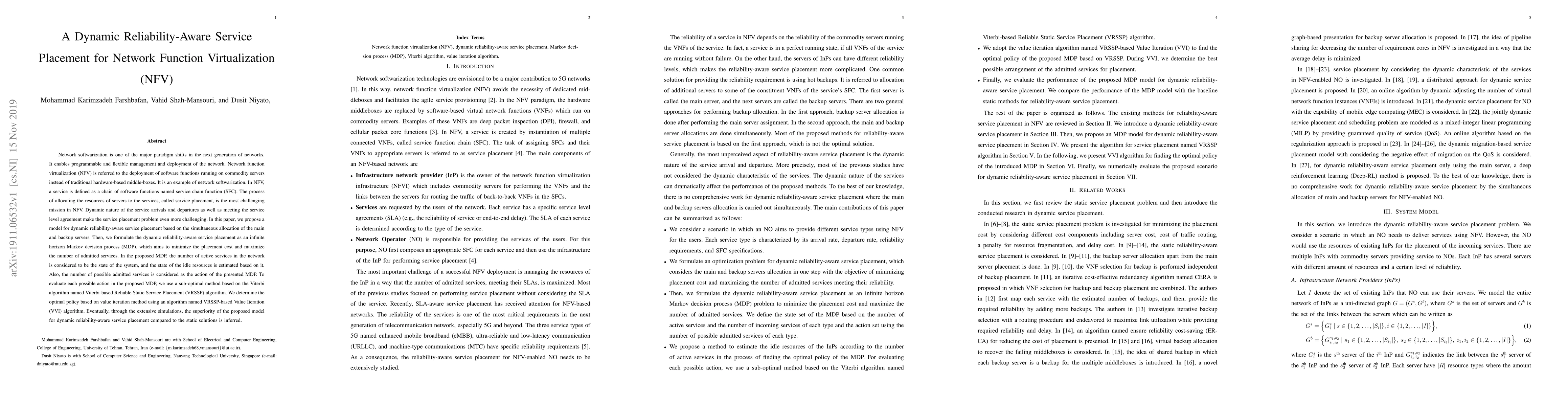 This paper proposes a dynamic reliability-aware service placement model for Network Function Virtualization (NFV) using an infinite horizon Markov decision process (MDP) to minimize cost and maximize admitted services. The model employs a Viterbi-based algorithm (VRSSP) and a value iteration method (VVI) to optimize server resource allocation and demonstrates superior performance through simulations compared to static solutions.
