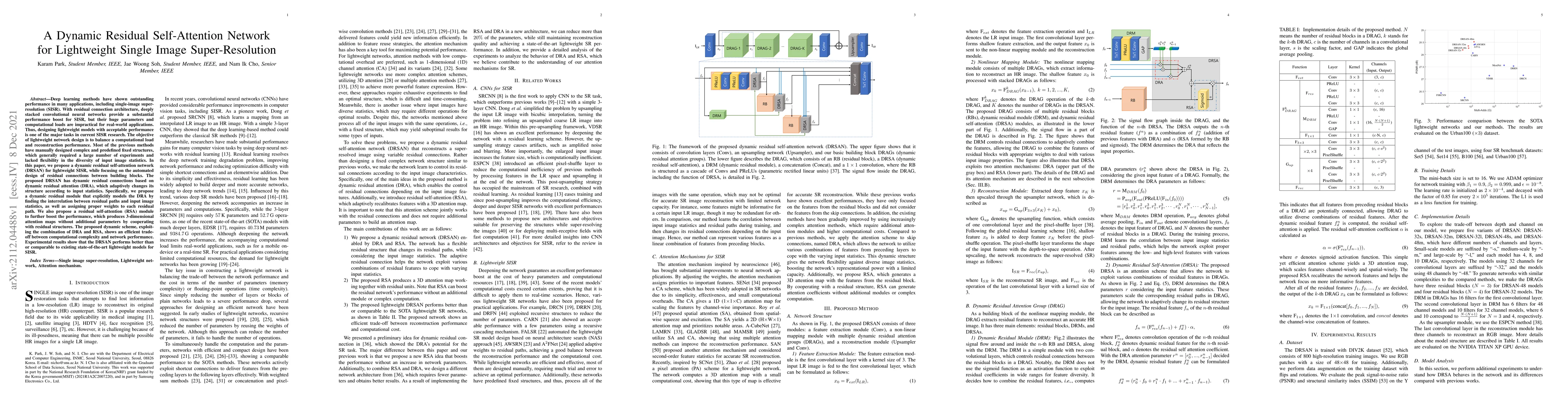 This paper proposes a dynamic residual self-attention network (DRSAN) for lightweight single image super-resolution (SISR) that adaptively designs residual connections based on dynamic residual attention (DRA) and residual self-attention (RSA) to balance computational efficiency and performance. The DRSAN outperforms or matches existing lightweight SISR models.