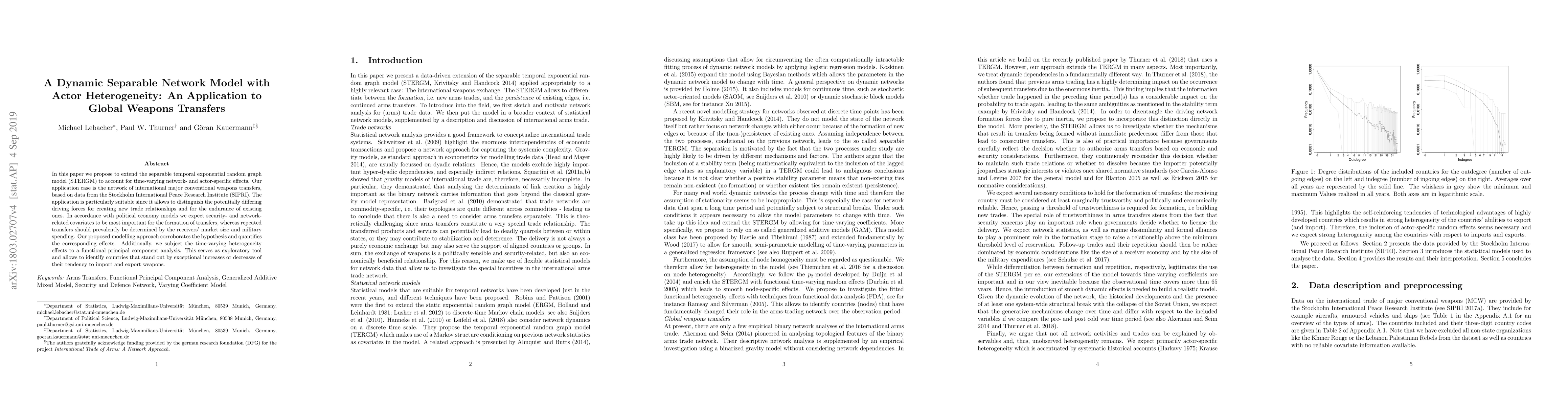 In this paper we propose to extend the separable temporal exponential random graph model (STERGM) to account for time-varying network- and actor-specific effects. Our application case is the network of international major conventional weapons transfers, based on data from the Stockholm International Peace Research Institute (SIPRI). The application is particularly suitable since it allows to distinguish the potentially differing driving forces for creating new trade relationships and for the endurance of existing ones. In accordance with political economy models we expect security- and network-related covariates to be most important for the formation of transfers, whereas repeated transfers should prevalently be determined by the receivers' market size and military spending. Our proposed modelling approach corroborates the hypothesis and quantifies the corresponding effects. Additionally, we subject the time-varying heterogeneity effects to a functional principal component analysis. This serves as exploratory tool and allows to identify countries that stand out by exceptional increases or decreases of their tendency to import and export weapons.